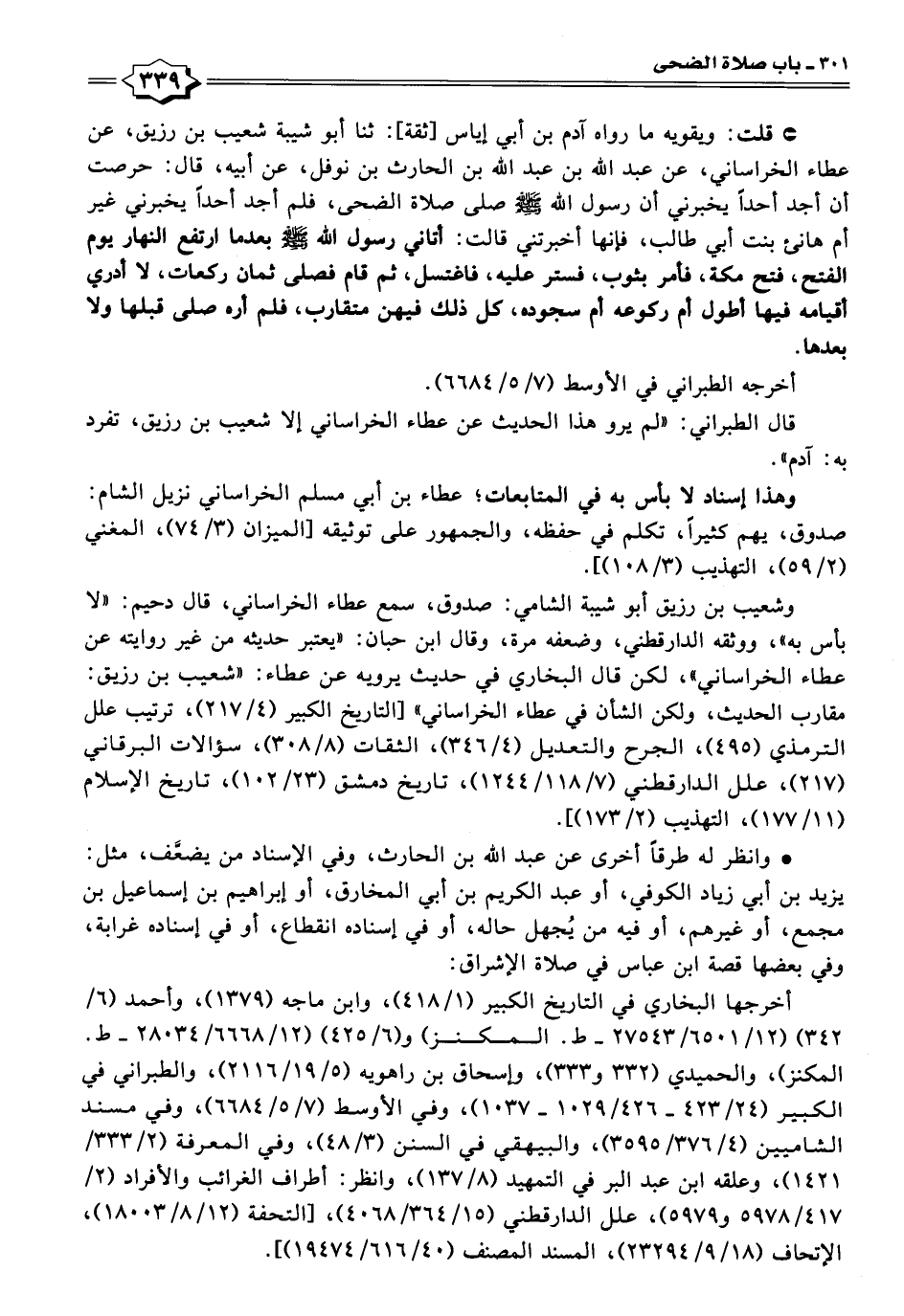 * قلت: ويقويه ما رواه آدم بن أبي إياس [ثقة]: ثنا أبو شيبة شعيب بن رزيق، عن عطاء الخراساني، عن عبد الله بن عبد الله بن الحارث بن نوفل، عن أبيه، قال: حرصت أن أجد أحدًا يخبرني أن رسول الله - صلى الله عليه وسلم - صلى صلاة الضحى، فلم أجد أحدًا يخبرني غير أم هانئ بنت أبي طالب، فإنها أخبرتني قالت: أتاني رسول الله - صلى الله عليه وسلم - بعدما ارتفع النهار يوم الفتح، فتح مكة، فأمر بثوب، فستر عليه، فاغتسل، ثم قام فصلى ثمان ركعات، لا أدري أقيامه فيها أطول أم ركوعه أم سجوده، كل ذلك فيهن متقارب، فلم أره صلى قبلها ولا بعدها.