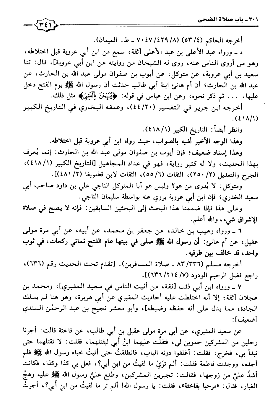 د - ورواه عبد الأعلى بن عبد الأعلى [ثقة، سمع من ابن أبي عروبة قبل اختلاطه، وهو من أروى الناس عنه، روى له الشيخان من روايته عن ابن أبي عروبة]، قال: ثنا سعيد بن أبي عروبة، عن متوكل، عن أيوب بن صفوان مولى عبد الله بن الحارث، عن عبد الله بن الحارث؛ أن أم هانئ ابنة أبي طالب حدثت أن رسول الله - صلى الله عليه وسلم - يوم الفتح دخل عليها، ... ثم ذكر نحوه، وعن ابن عباس في قوله: {يُسَبِّحْنَ بِالْعَشِيِّ} مثل ذلك.