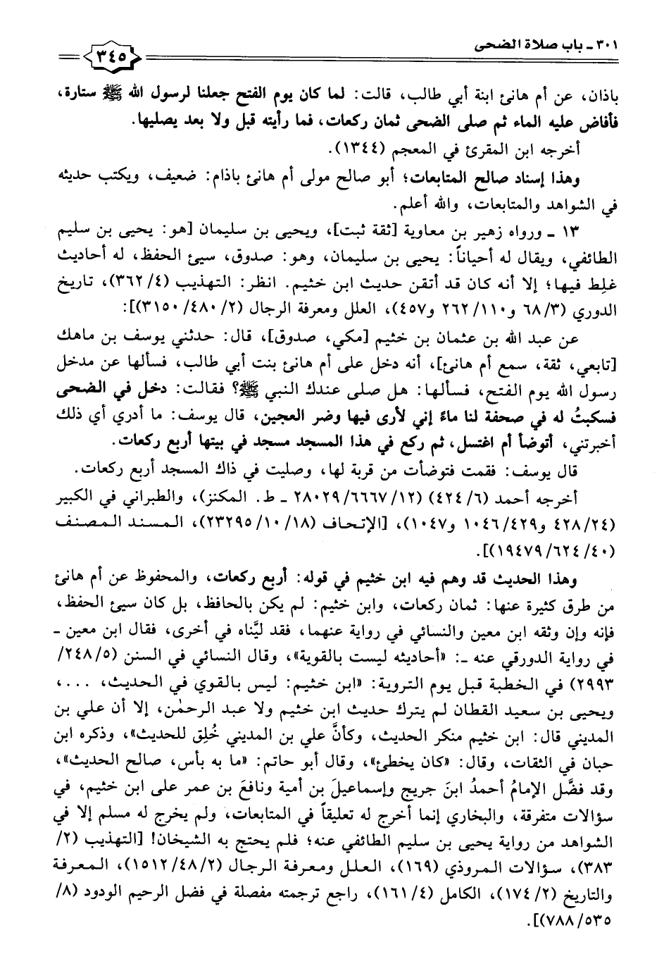 وهذا الحديث قد وهم فيه ابن خثيم في قوله: أربع ركعات، والمحفوظ عن أم هانئ من طرق كثيرة عنها: ثمان ركعات، وابن خثيم: لم يكن بالحافظ، بل كان سيئ الحفظ، فإنه وإن وثقه ابن معين والنسائي في رواية عنهما، فقد ليَّناه في أخرى، فقال ابن معين - في رواية الدورقي عنه -: "أحاديثه ليست بالقوية"، وقال النسائي في السنن (٥/ ٢٤٨ / ٢٩٩٣) في الخطبة قبل يوم التروية: "ابن خثيم: ليس بالقوي في الحديث، ... ، ويحيى بن سعيد القطان لم يترك حديث ابن خثيم ولا عبد الرحمن، إلا أن علي بن المديني قال: ابن خثيم منكر الحديث، وكأنَّ علي بن المديني خُلِق للحديث"، وذكره ابن حبان في الثقات، وقال: "كان يخطئ"، وقال أبو حاتم: "ما به بأس، صالح الحديث"، وقد فضَّل الإمامُ أحمدُ ابنَ جريج وإسماعيلَ بن أمية ونافعَ بن عمر على ابن خثيم، في سؤالات متفرقة، والبخاري إنما أخرج له تعليقًا في المتابعات، ولم يخرج له مسلم إلا في الشواهد من رواية يحيى بن سليم الطائفي عنه؛ فلم يحتج به الشيخان! [التهذيب [٢/ ٣٨٣)، سؤالات المروذي (١٦٩)، العلل ومعرفة الرجال (٢/ ٤٨/ ١٥١٢)، المعرفة والتاريخ (٢/ ١٧٤)، الكامل (٤/ ١٦١)، راجع ترجمته مفصلة في فضل الرحيم الودود (٨/ ٥٣٥/ ٧٨٨)].