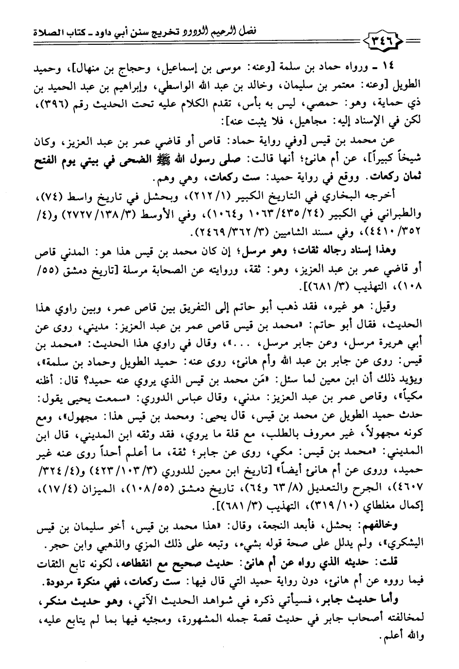 عن محمد بن قيس [وفي رواية حماد: قاص أو قاضي عمر بن عبد العزيز، وكان شيخًا كبيرًا]، عن أم هانئ؛ أنها قالت: صلى رسول الله - صلى الله عليه وسلم - الضحى في بيتي يوم الفتح ثمان ركعات. ووقع في رواية حميد: ست ركعات، وهي وهم.