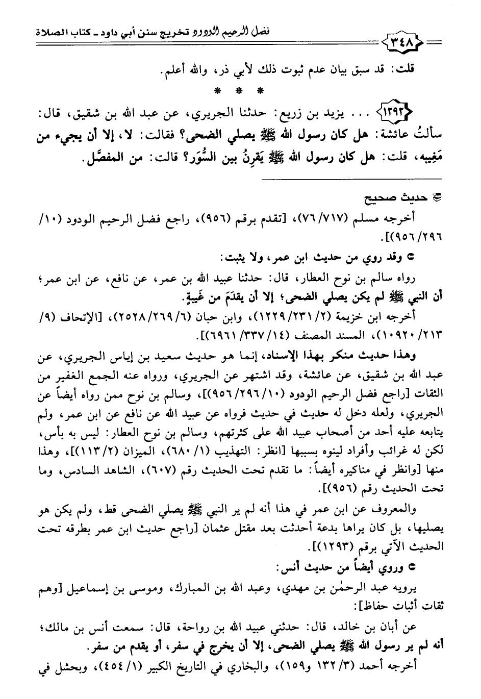 ١٢٩٢ - . . . يزيد بن زريع: حدثنا الجريري، عن عبد الله بن شقيق، قال: سألتُ عائشة: هل كان رسول الله - صلى الله عليه وسلم - يصلي الضحى؟ فقالت: لا، إلا أن يجيء من مَغِيبه، قلت: هل كان رسول الله - صلى الله عليه وسلم - يَقرِنُ بين السُّوَر؟ قالت: من المفصَّل.