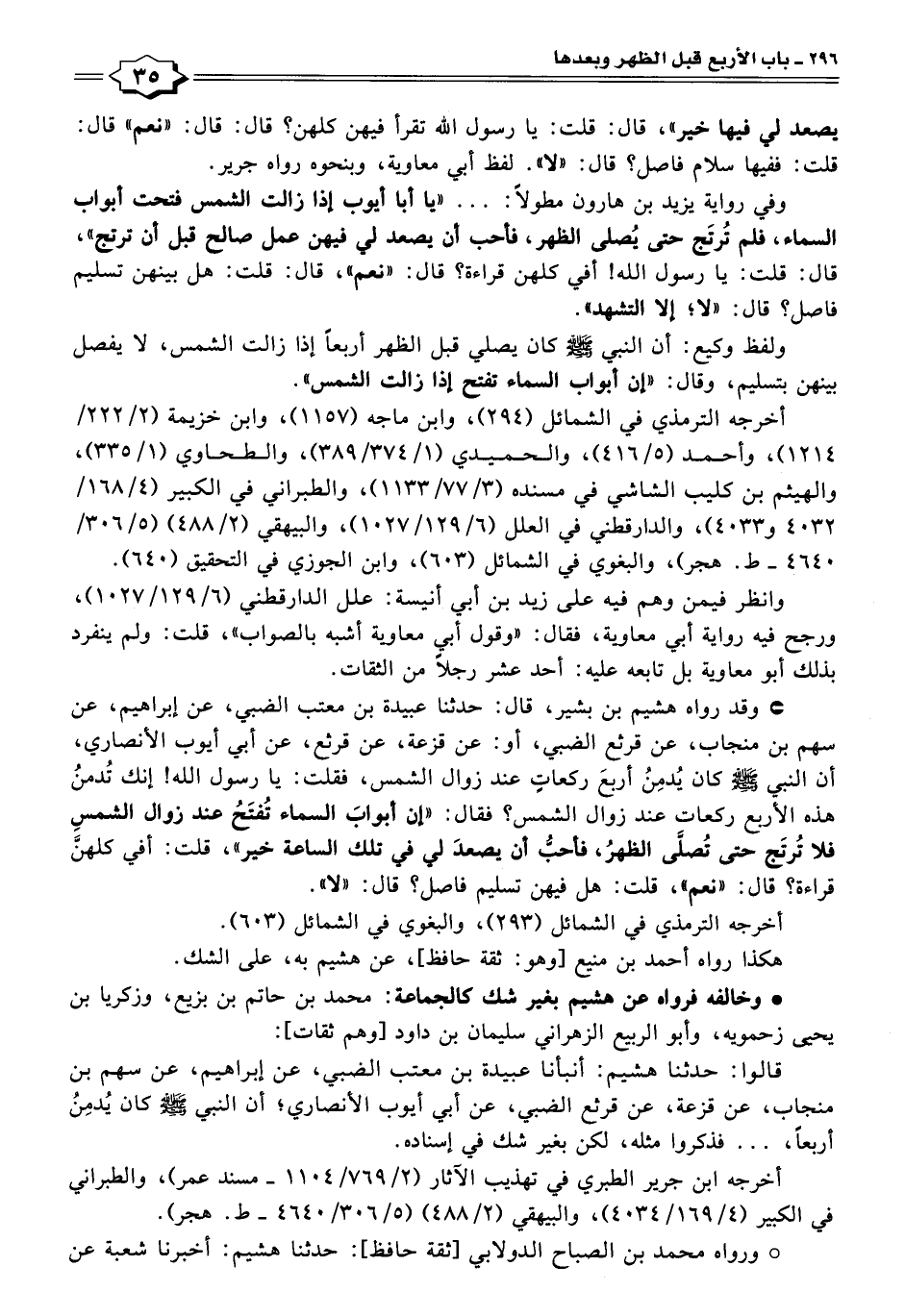 وفي رواية يزيد بن هارون مطولًا: ... "يا أبا أيوب إذا زالت الشمس فتحت أبواب السماء، فلم تُرتَج حتى يُصلى الظهر، فأحب أن يصعد لي فيهن عمل صالح قبل أن ترتج"، قال: قلت: يا رسول الله! أفي كلهن قراءة؟ قال: "نعم"، قال: قلت: هل بينهن تسليم فاصل؟ قال: "لا؛ إلا التشهد".