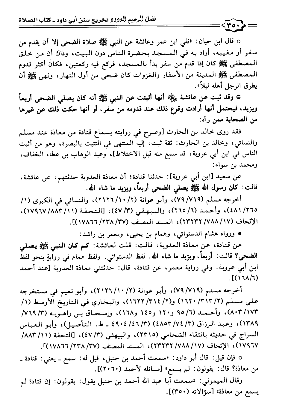 * قال ابن حبان: "نفي ابن عمر وعائشة عن النبي - صلى الله عليه وسلم - صلاة الضحى إلا أن يقدم من سفر أو مغيبه، أراد به في المسجد بحضرة الناس دون البيت، وذاك أن من خلق المصطفى - صلى الله عليه وسلم - كان إذا قدم من سفر بدأ بالمسجد، فركع فيه ركعتين، فكان أكثر قدوم المصطفى - صلى الله عليه وسلم - المدينة من الأسفار والغزوات كان ضحى من أول النهار، ونهى - صلى الله عليه وسلم - أن يطرق الرجل أهله ليلًا".
