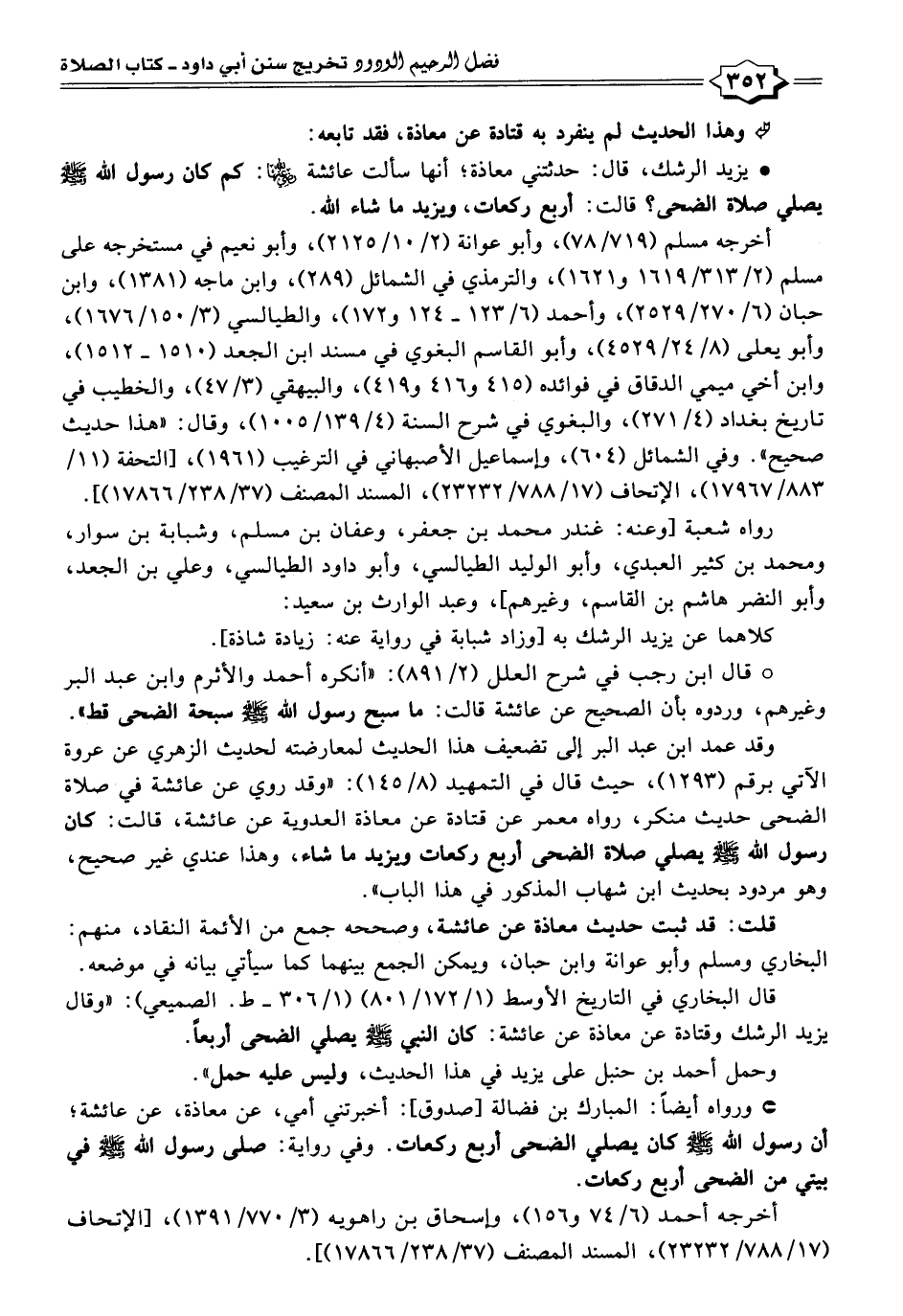 * ورواه أيضًا: المبارك بن فضالة [صدوق]: أخبرتني أمي، عن معاذة، عن عائشة؛ أن رسول الله - صلى الله عليه وسلم - كان يصلي الضحى أربع ركعات. وفي رواية: صلى رسول الله - صلى الله عليه وسلم - في بيتي من الضحى أربع ركعات.