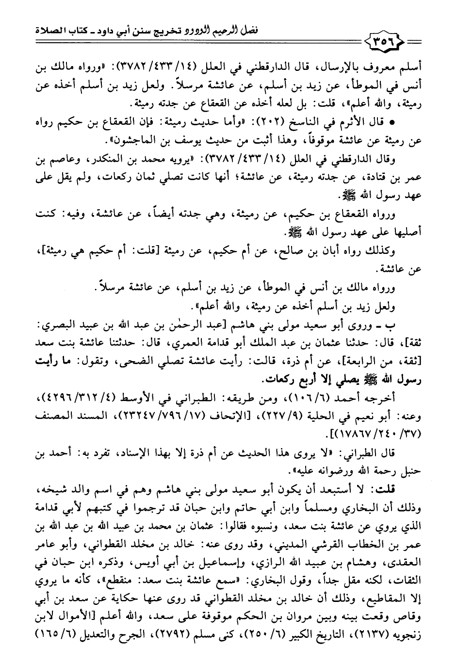 ب - وروى أبو سعيد مولى بني هاشم [عبد الرحمن بن عبد الله بن عبيد البصري: ثقة]، قال: حدثنا عثمان بن عبد الملك أبو قدامة العمري، قال: حدثتنا عائشة بنت سعد [ثقة، من الرابعة]، عن أم ذرة، قالت: رأيت عائشة تصلي الضحى، وتقول: ما رأيت رسول الله - صلى الله عليه وسلم - يصلي إلا أربع ركعات.