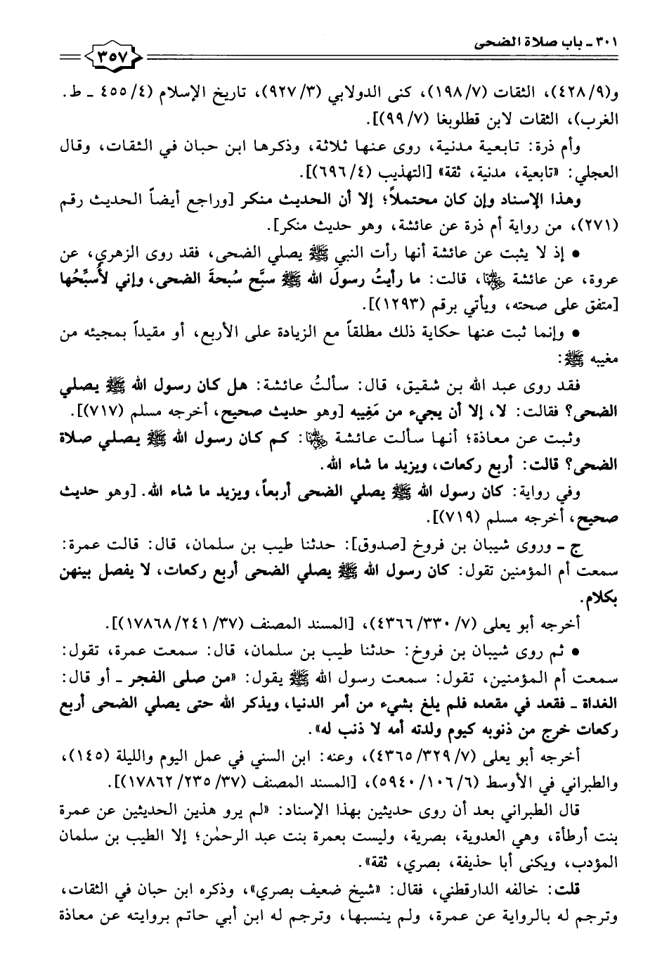 ج - وروى شيبان بن فروخ [صدوق]: حدثنا طيب بن سلمان، قال: قالت عمرة: سمعت أم المؤمنين تقول: كان رسول الله - صلى الله عليه وسلم - يصلي الضحى أربع ركعات، لا يفصل بينهن بكلام.