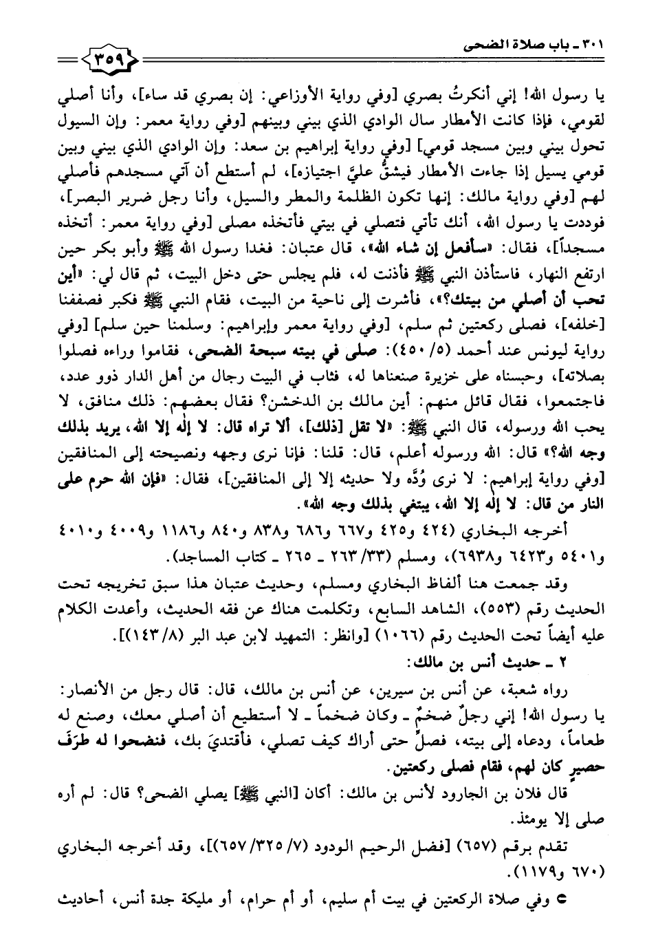 وقد جمعت هنا ألفاظ البخاري ومسلم، وحديث عتبان هذا سبق تخريجه تحت الحديث رقم (٥٥٣)، الشاهد السابع، وتكلمت هناك عن فقه الحديث، وأعدت الكلام عليه أيضًا تحت الحديث رقم (١٠٦٦) [وانظر: التمهيد لابن عبد البر (٨/ ١٤٣)].