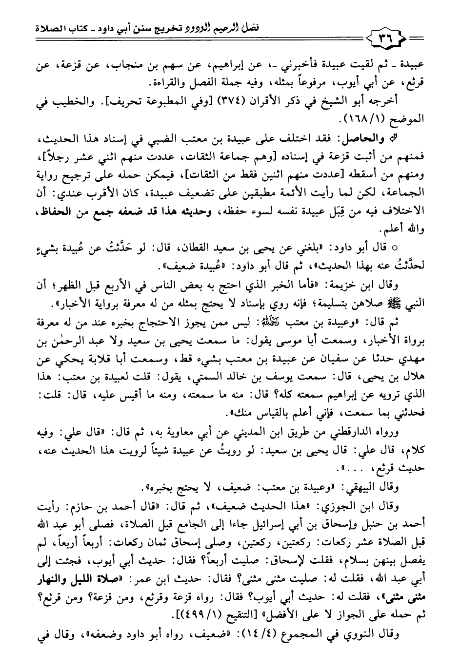 ° قال أبو داود: "بلغني عن يحيى بن سعيد القطان، قال: لو حَدَّثتُ عن عُبيدة بشئٍ لحدَّثتُ عنه بهذا الحديث"، ثم قال أبو داود: "عُبيدة ضعيف".