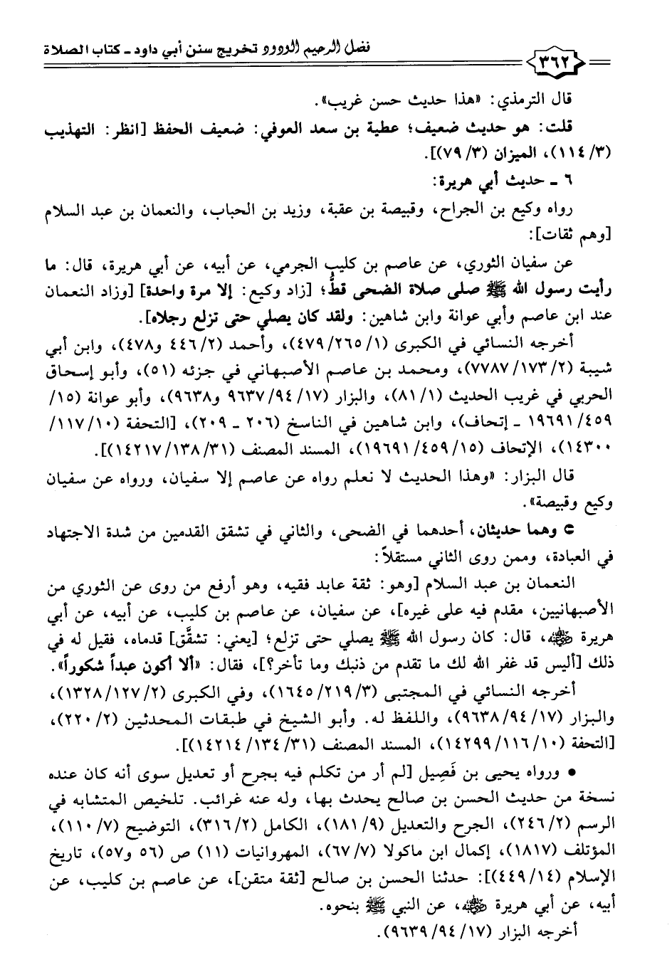 عن سفيان الثوري، عن عاصم بن كليب الجرمي، عن أبيه، عن أبي هريرة، قال: ما رأيت رسول الله - صلى الله عليه وسلم - صلى صلاة الضحى قطُّ؛ [زاد وكيع: إلا مرة واحدة] [وزاد النعمان عند ابن عاصم وأبي عوانة وابن شاهين: ولقد كان يصلي حتى تزلع رجلاه].