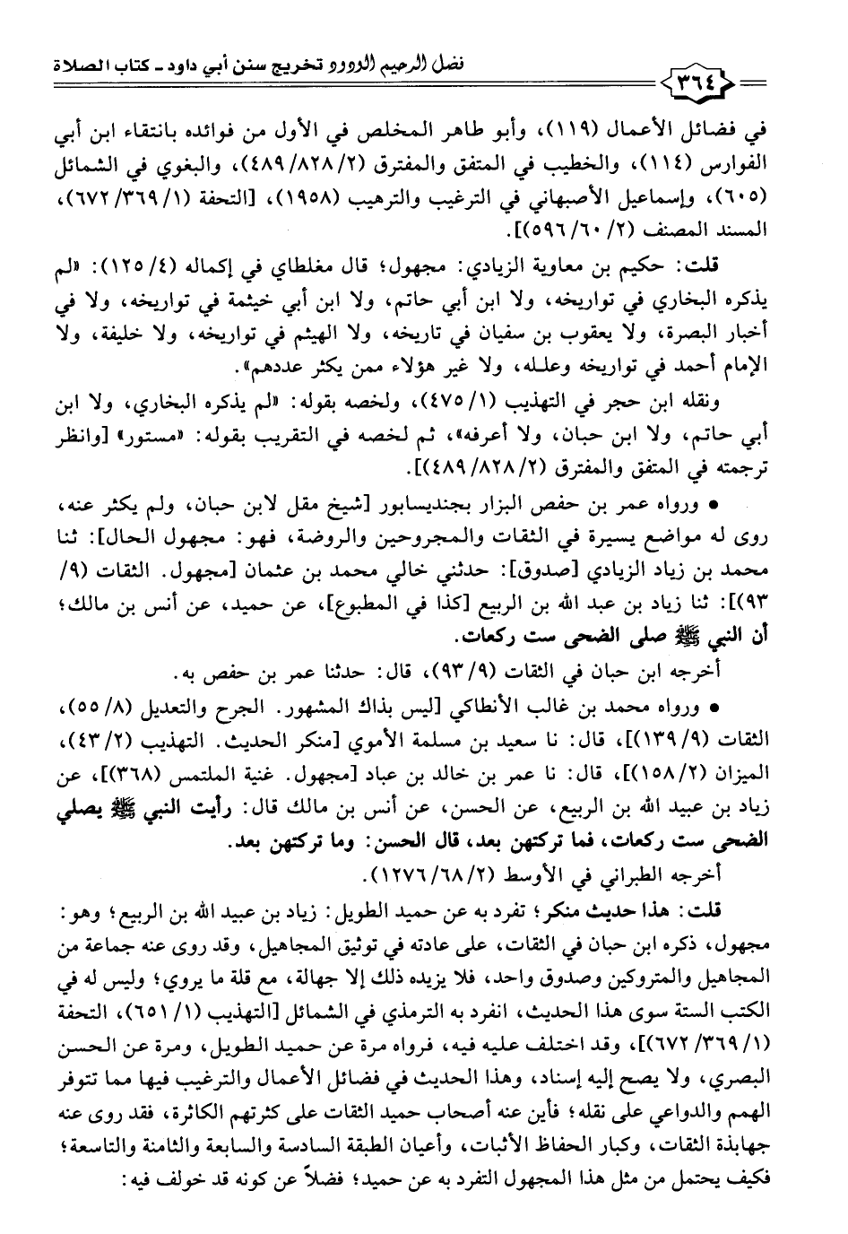 • ورواه عمر بن حفص البزار بجنديسابور [شيخ مقل لابن حبان، ولم يكثر عنه، روى له مواضع يسيرة في الثقات والمجروحين والروضة، فهو: مجهول الحال]: ثنا محمد بن زياد الزيادي [صدوق]: حدثني خالي محمد بن عثمان [مجهول. الثقات (٩/ ٩٣)]: ثنا زياد بن عبد الله بن الربيع [كذا في المطبوع]، عن حميد، عن أنس بن مالك؛ أن النبي - صلى الله عليه وسلم - صلى الضحى ست ركعات.