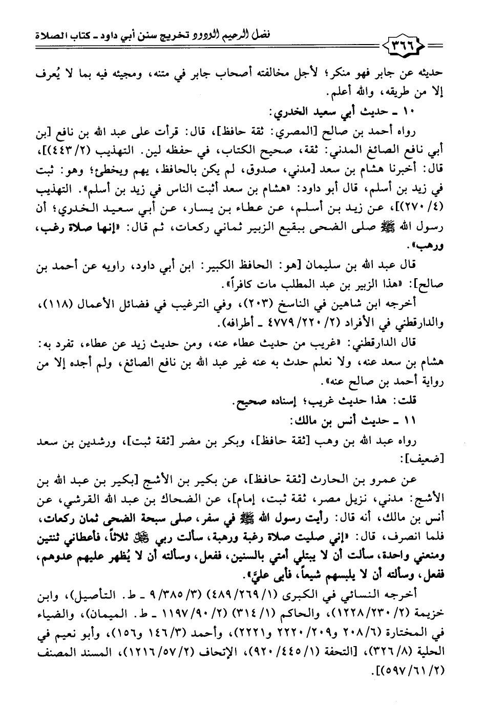 رواه أحمد بن صالح [المصري: ثقة حافظ]، قال: قرأت على عبد الله بن نافع [بن أبي نافع الصائغ المدني: ثقة، صحيح الكتاب، في حفظه لين. التهذيب (٢/ ٤٤٣)]، قال: أخبرنا هشام بن سعد [مدني، صدوق، لم يكن بالحافظ، يهم ويخطئ؛ وهو: ثبت في زيد بن أسلم، قال أبو داود: "هشام بن سعد أثبت الناس في زيد بن أسلم". التهذيب (٤/ ٢٧٠)]، عن زيد بن أسلم، عن عطاء بن يسار، عن أبي سعيد الخدري؛ أن رسول الله - صلى الله عليه وسلم - صلى الضحى ببقيع الزبير ثماني ركعات، ثم قال: "إنها صلاة رغب، ورهب".