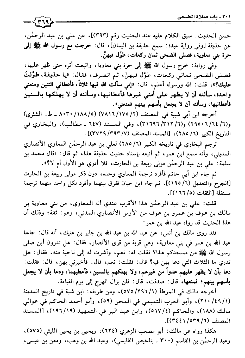 وفي رواية: خرج رسول الله - صلى الله عليه وسلم - إلى حرة بني معاوية، واتبعت أثره حتى ظهر عليها، فصلى الضحى ثماني ركعات، طوَّل فيهنَّ، ثم انصرف، فقال: "يا حذيفة، طوَّلتُ عليك؟ "، قلت: الله ورسوله أعلم، قال: "إني سألت الله فيها ثلاثًا، فأعطاني اثنتين ومنعني واحدة، سألته أن لا يظهر على أمتي غيرها فأعطانيها، وسألته أن لا يهلكها بالسنين فأعطانيها، وسألته أن لا يجعل بأسهم بينهم فمنعني".