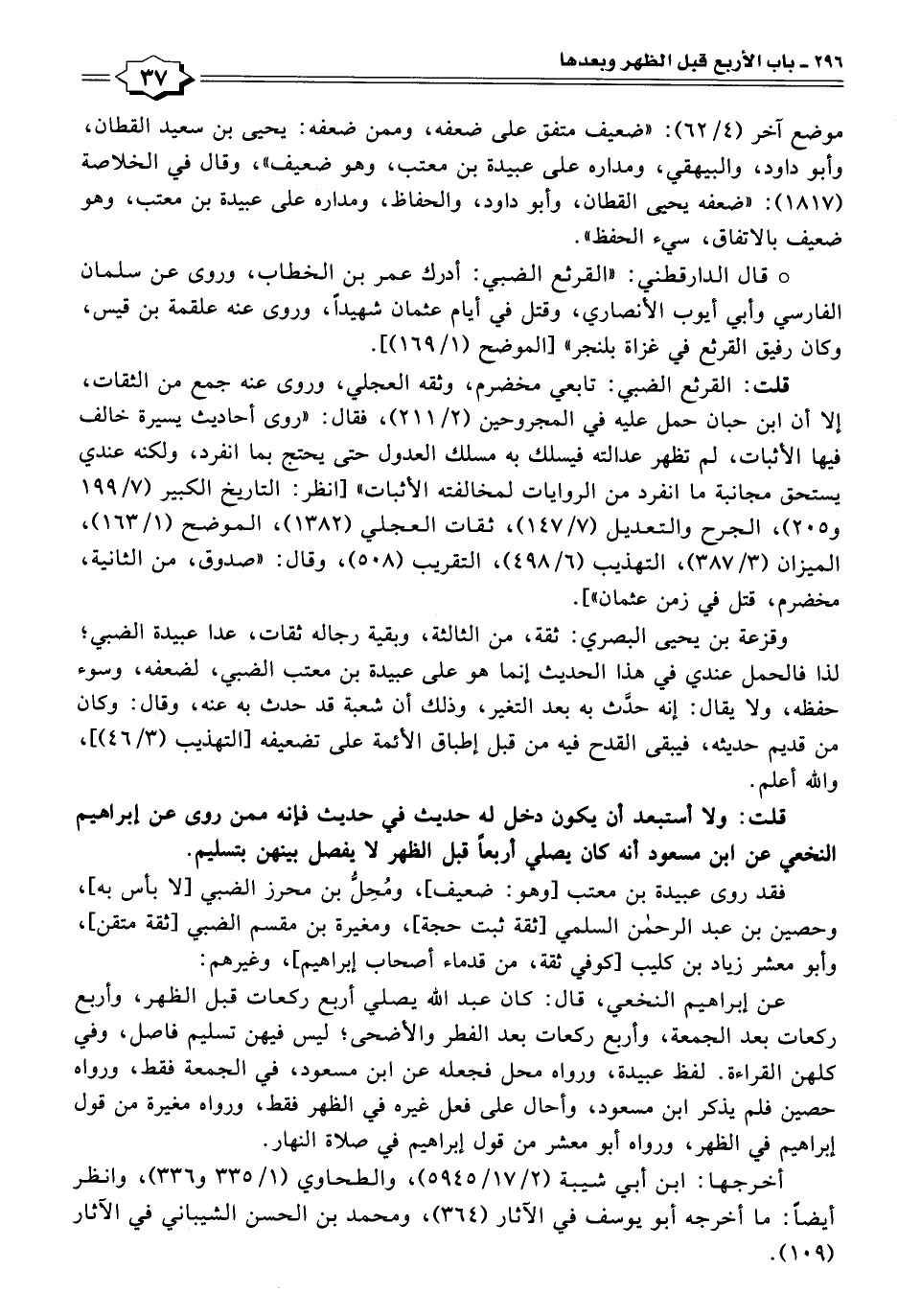 عن إبراهيم النخعي، قال: كان عبد الله يصلي أربع ركعات قبل الظهر، وأربع ركعات بعد الجمعة، وأربع ركعات بعد الفطر والأضحى؛ ليس فيهن تسليم فاصل، وفي كلهن القراءة. لفظ عبيدة، ورواه محل فجعله عن ابن مسعود، في الجمعة فقط، ورواه حصين فلم يذكر ابن مسعود، وأحال على فعل غيره في الظهر فقط، ورواه مغيرة من قول إبراهيم في الظهر، ورواه أبو معشر من قول إبراهيم في صلاة النهار.