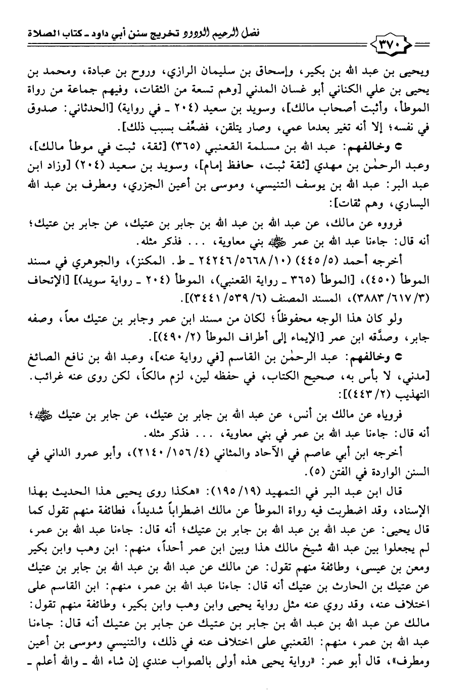 * وخالفهم: عبد الله بن مسلمة القعنبي (٣٦٥) [ثقة، ثبت في موطأ مالك]، وعبد الرحمن بن مهدي [ثقة ثبت، حافظ إمام]، وسويد بن سعيد (٢٠٤) [وزاد ابن عبد البر: عبد الله بن يوسف التنيسي، وموسى بن أعين الجزري، ومطرف بن عبد الله اليساري، وهم ثقات]: