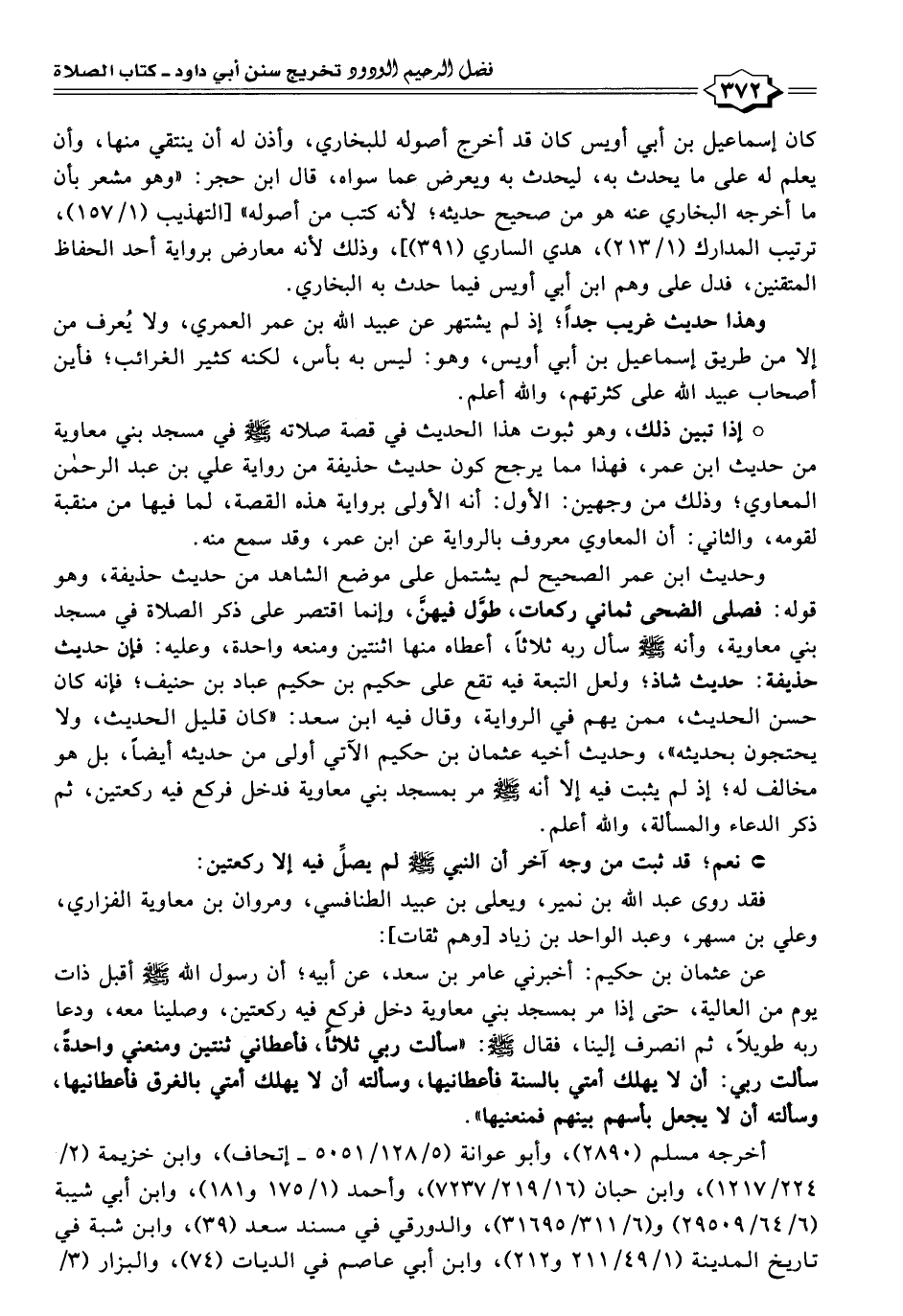 وحديث ابن عمر الصحيح لم يشتمل على موضع الشاهد مت حديث حذيفة، وهو قوله: فصلى الضحى ثماني ركعات، طوَّل فيهنَّ، وإنما اقتصر على ذكر الصلاة في مسجد بني معاوية، وأنه - صلى الله عليه وسلم - سأل ربه ثلاثًا، أعطاه منها اثنتين ومنعه واحدة، وعليه: فإن حديث حذيفة: حديث شاذ؛ ولعل التبعة فيه تقع على حكيم بن حكيم عباد بن حنيف؛ فإنه كان حسن الحديث، ممن يهم في الرواية، وقال فيه ابن سعد: "كان قليل الحديث، ولا يحتجون بحديثه"، وحديث أخيه عثمان بن حكيم الآتي أولى من حديثه أيضًا، بل هو مخالف له؛ إذ لم يثبت فيه إلا أنه - صلى الله عليه وسلم - مر بمسجد بني معاوية فدخل فركع فيه ركعتين، ثم ذكر الدعاء والمسألة، والله أعلم.