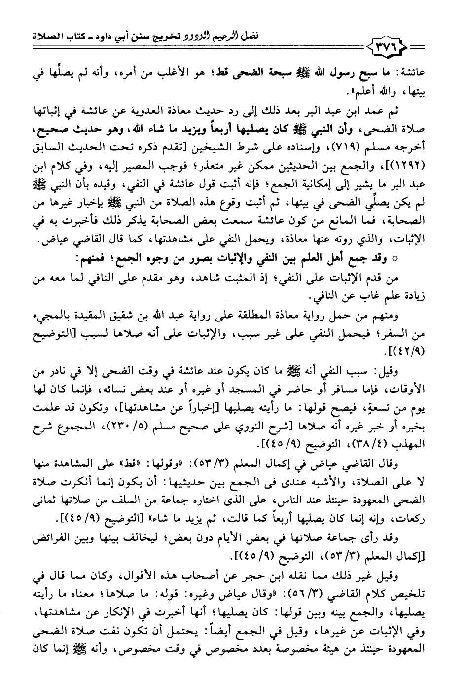 ثم عمد ابن عبد البر بعد ذلك إلى رد حديث معاذة العدوية عن عائشة في إثباتها صلاة الضحى، وأن النبي - صلى الله عليه وسلم - كان يصليها أربعًا ويزيد ما شاء الله، وهو حديث صحيح، أخرجه مسلم (٧١٩)، وإسناده على شرط الشيخين [تقدم ذكره تحت الحديث السابق (١٢٩٢)]، والجمع بين الحديثين ممكن غير متعذر؛ فوجب المصير إليه، وفي كلام ابن عبد البر ما يشير إلى إمكانية الجمع؛ فإنه أثبت قول عائشة في النفي، وقيده بأن النبي - صلى الله عليه وسلم - لم يكن يصلِّي الضحى في بيتها، ثم أثبت وقوع هذه الصلاة من النبي - صلى الله عليه وسلم - بإخبار غيرها من الصحابة، فما المانع من كون عائشة سمعت بعض الصحابة يذكر ذلك فأخبرت به في الإثبات، والذي روته عنها معاذة، ويحمل النفي على مشاهدتها، كما قال القاضي عياض.