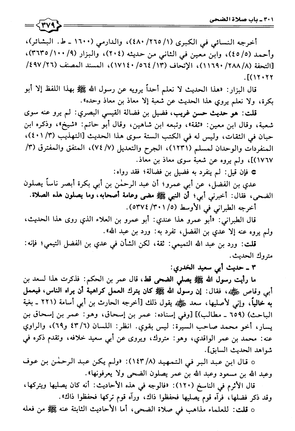 ° قال ابن عبد البر في التمهيد (٨/ ١٤٣): "ولم يكن عبد الرحمن بن عوف وعبد الله بن مسعود وعبد الله بن عمر يصلون الضحى ولا يعرفونها".
