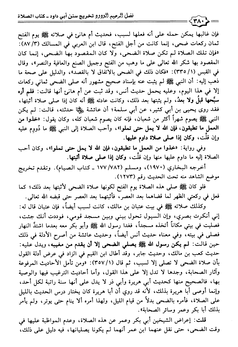 فإن غالبها يمكن حمله على أنه فعلها لسبب، فحديث أم هانئ في صلاته - صلى الله عليه وسلم - يوم الفتح ثمان ركعات ضحى، إنما كانت من أجل الفتح، قال ابن العربي في المسالك (٣/ ٨٧): "فإن تلك الصلاة لم تكن صلاة الضحى، ولا كان المقصود بها الضحى، إنما كان المقصود بها شكر الله تعالى على ما وهب من الفتح وجميل الصنع والعافية والنصر"، وقال في القبس (١/ ٣٣٥): "فكان ذلك في الضحى بالاتفاق لا بالقصد"، والدليل على صحة ما ذهب إليه: أن النبي - صلى الله عليه وسلم - لم يثبت عنه بإسناد صحيح مشهور أنه صلى الضحى ثماني ركعات إلا في هذا اليوم، وعليه يحمل حديث أنس، وقد ثبت عن أم هانئ أنها قالت: فلم أره سبَّحها قبلُ ولا بعدُ، ولم يثبتها بعد ذلك، وكانت عادته - صلى الله عليه وسلم - أنه كان إذا صلى صلاة أثبتها، فقد روى يحيى بن أبي كثير، عن أبي سلمة؛ أن عائشة - رضي الله عنه - حدثته، قالت: لم يكن النبي - صلى الله عليه وسلم - يصوم شهرًا أكثر من شعبان، فإنه كان يصوم شعبان كله، وكان يقول: "خذوا من العمل ما تطيقون، فإن الله لا يمل حتى تملوا"، وأحب الصلاة إلى النبي - صلى الله عليه وسلم - ما دُووِم عليه وإن قلَّت، وكان إذا صلى صلاة داوم عليها.