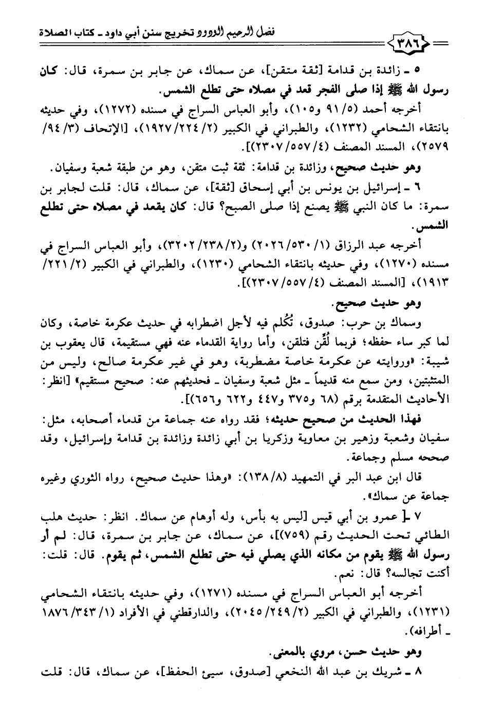 ٥ - زائدة بن قدامة [ثقة متقن]، عن سماك، عن جابر بن سمرة، قال: كان رسول الله - صلى الله عليه وسلم - إذا صلى الفجر قعد في مصلاه حتى تطلع الشمس.