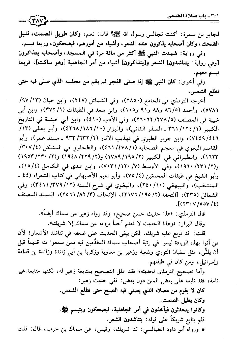 وفي رواية: شهدت النبي - صلى الله عليه وسلم - أكثر من مائة مرة في المسجد، وأصحابه يتذاكرون [وفي رواية: يتناشدون] الشعر و [يتذاكرون] أشياء من أمر الجاهلية [وهو ساكت]، فربما تبسم معهم.