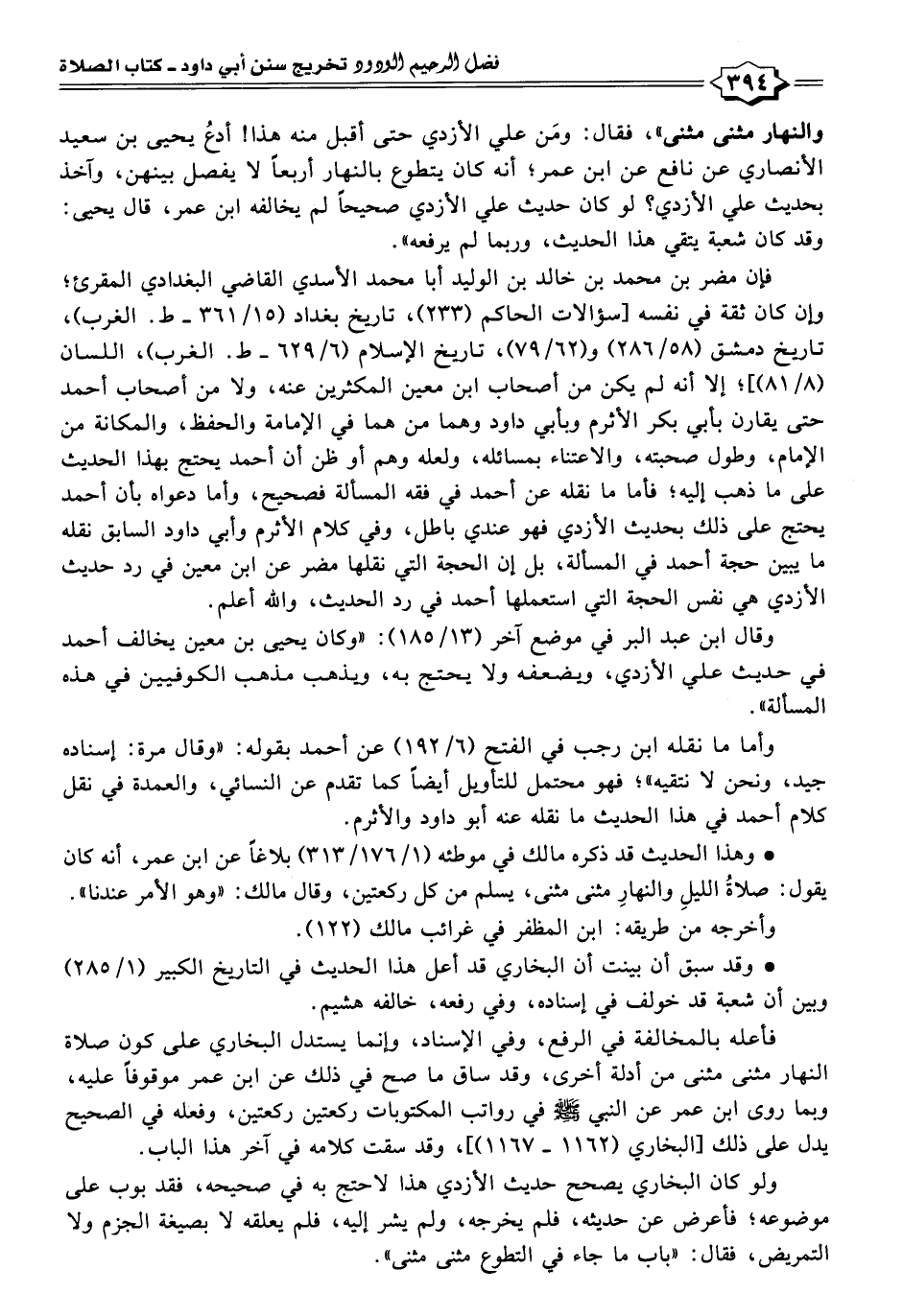 فأعله بالمخالفة في الرفع، وفي الإسناد، وإنما يستدل البخاري على كون صلاة النهار مثنى مثنى من أدلة أخرى، وقد ساق ما صح في ذلك عن ابن عمر موقوفًا عليه، وبما روى ابن عمر عن النبي - صلى الله عليه وسلم - في رواتب المكتوبات ركعتين ركعتين، وفعله في الصحيح يدل على ذلك [البخاري (١١٦٢ - ١١٦٧)]، وقد سقت كلامه في آخر هذا الباب.