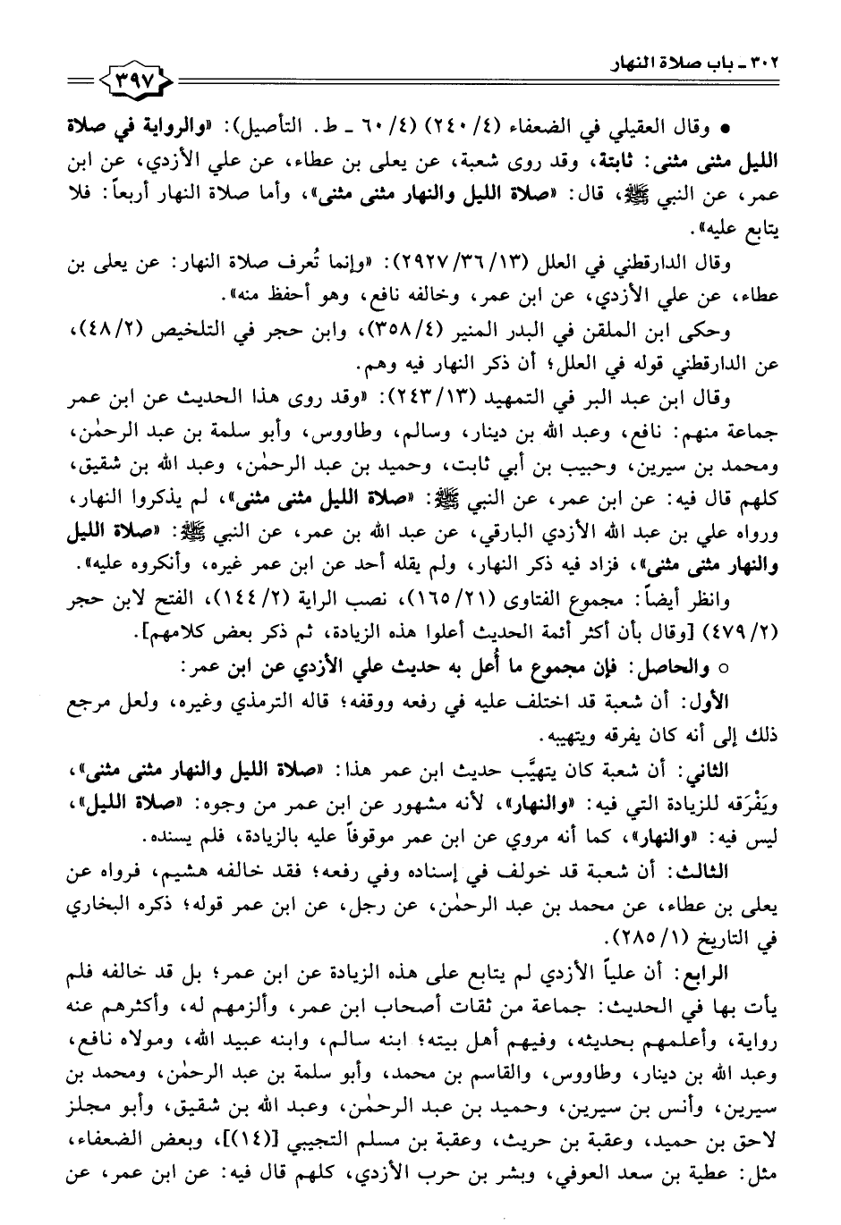 وقال ابن عبد البر في التمهيد (١٣/ ٢٤٣): "وقد روى هذا الحديث عن ابن عمر جماعة منهم: نافع، وعبد الله بن دينار، وسالم، وطاووس، وأبو سلمة بن عبد الرحمن، ومحمد بن سيرين، وحبيب بن أبي ثابت، وحميد بن عبد الرحمن، وعبد الله بن شقيق، كلهم قال فيه: عن ابن عمر، عن النبي - صلى الله عليه وسلم -: "صلاة الليل مثنى مثنى"، لم يذكروا النهار، ورواه علي بن عبد الله الأزدي البارقي، عن عبد الله بن عمر، عن النبي - صلى الله عليه وسلم -: "صلاة الليل والنهار مثنى مثنى"، فزاد فيه ذكر النهار، ولم يقله أحد عن ابن عمر غيره، وأنكروه عليه".