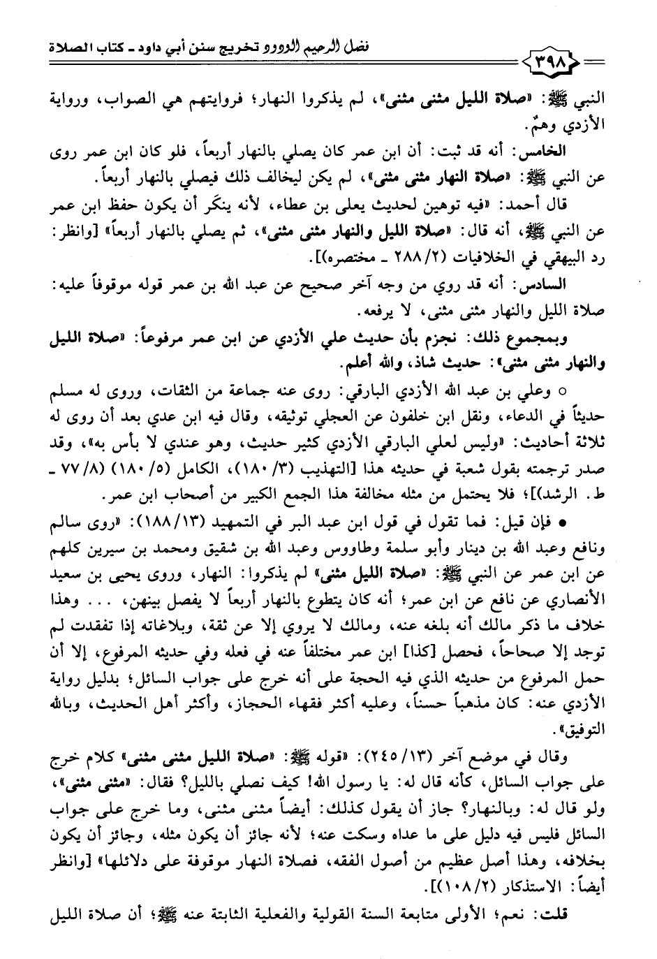 النبي - صلى الله عليه وسلم -:" صلاة الليل مثنى مثنى"، لم يذكروا النهار؛ فروايتهم هي الصواب، ورواية الأزدي وهمٌ.
