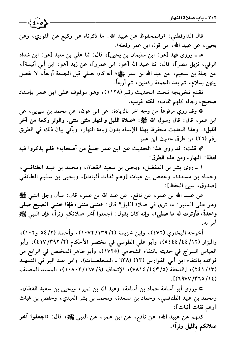 • وقد روي مرفوعًا من وجه آخر بالزيادة: عن ابن عون، عن محمد بن سيرين، عن ابن عمر، قال: قال رسول الله - صلى الله عليه وسلم -: "صلاة الليل والنهار مثنى مثنى، والوتر ركعة من آخر الليل". وهذا الحديث محفوظ بهذا الإسناد بدون زيادة النهار، ويأتى بيان ذلك في الطريق رقم (٢٦) من طرق حديث ابن عمر.