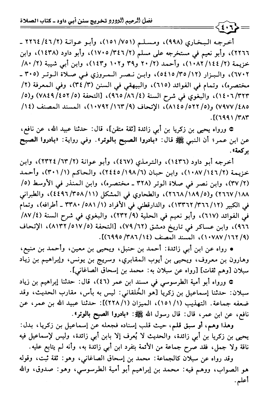 أخرجه أبو داود (١٤٣٦)، والترمذي (٤٦٧)، وأبو عوانة (٢/ ٦٣/ ٢٣٢٤)، وابن خزيمة (٢/ ١٤٦/ ١٠٨٧)، وابن حبان (٦/ ١٩٨/ ٢٤٤٥)، والحاكم (١/ ٣٠١)، وأحمد (٢/ ٣٧)، وابن نصر في صلاة الوتر (٣٢٨ - مختصره)، وابن المنذر في الأوسط (٥/ ١٨٨/ ٢٦٦٧) و (٥/ ١٨٩/ ٢٦٦٨)، والطحاوي في المشكل (١١/ ٣٥٨/ ٤٤٩٦)، والطبراني في الكبير (١٢/ ٣٦٦/ ١٣٣٦٢)، والدارقطني في الأفراد (١/ ٥٨١/ ٣٣٨٠ - أطرافه)، وتمام في الفوائد (٦١٧)، وأبو نعيم في الحلية (٩/ ٢٣٢)، والبغوي في شرح السنة (٤/ ٨٧ ٩٦٦)، وابن عساكر في تاريخ دمشق (٦٢/ ٧٩)، [التحفة (٥/ ٥١٧/ ٨١٣٢)، الإتحاف (٩/ ١٦٢/ ١٠٧٨٧)، المسند المصنف (١٤/ ٣٨٦/ ٦٩٩٥)].