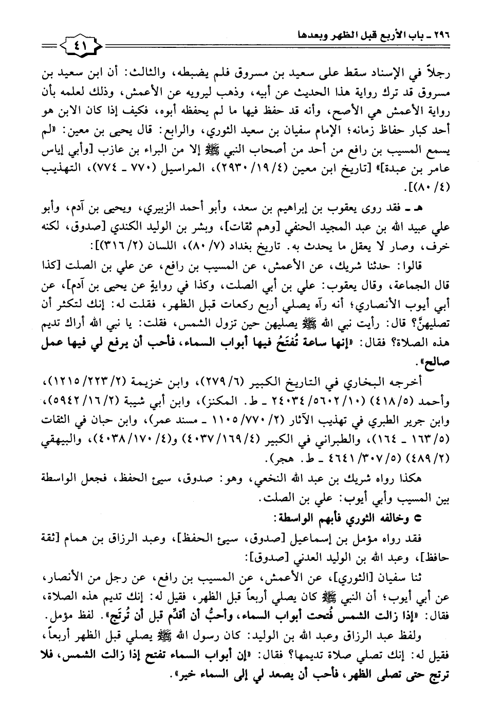ثنا سفيان [الثوري]، عن الأعمش، عن المسيب بن رافع، عن رجل من الأنصار، عن أبي أيوب؛ أن النبي - صلى الله عليه وسلم - كان يصلي أربعًا قبل الظهر، فقيل له: إنك تديم هذه الصلاة، فقال: "إذا زالت الشمس فُتحت أبواب السماء، وأحبُّ أن أقدِّم قبل أن تُرتَج". لفظ مؤمل.