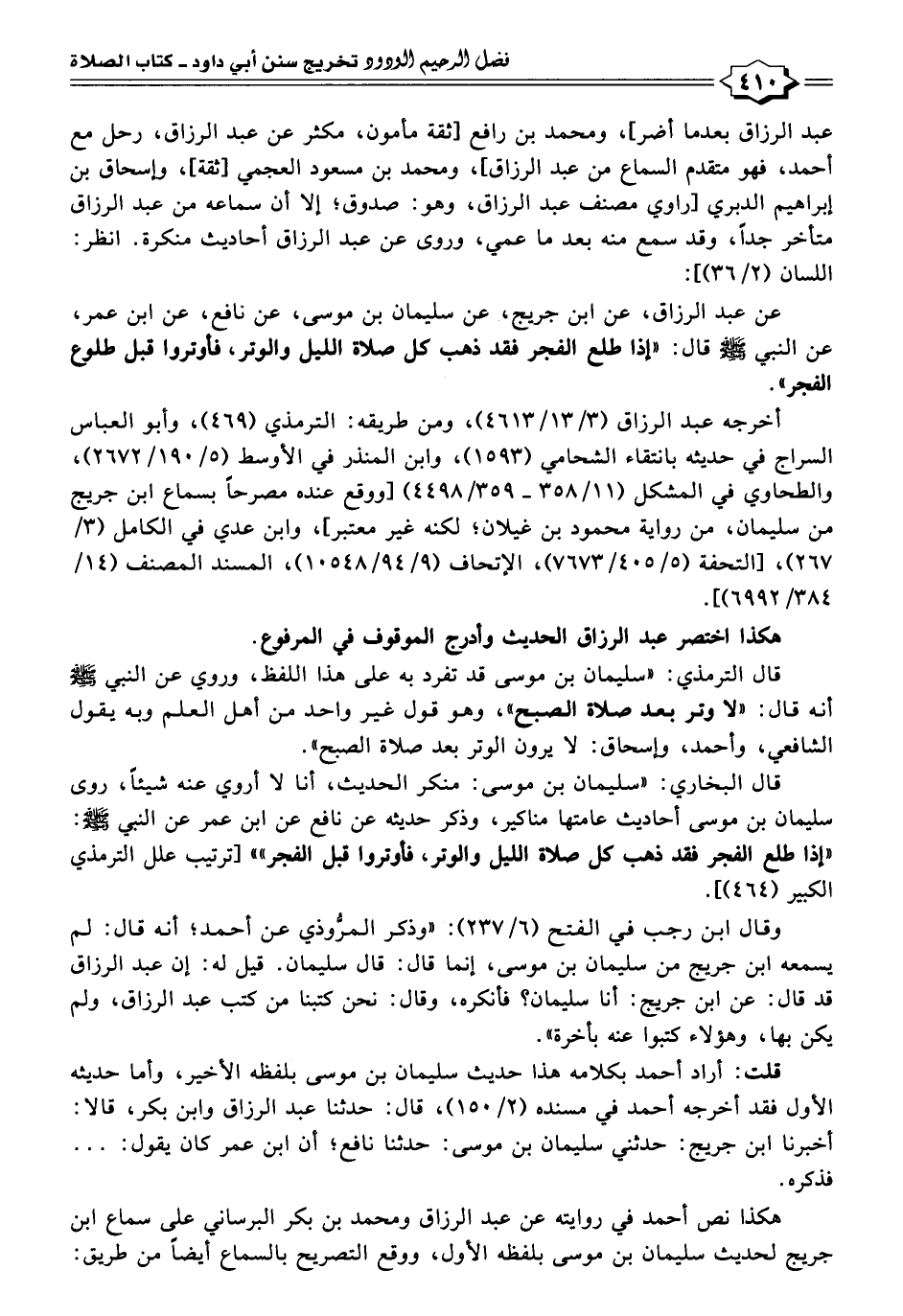 قال الترمذي: "سليمان بن موسى قد تفرد به على هذا اللفظ، وروي عن النبي - صلى الله عليه وسلم - أنه قال: "لا وتر بعد صلاة الصبح"، وهو قول غير واحد من أهل العلم وبه يقول الشافعي، وأحمد، وإسحاق: لا يرون الوتر بعد صلاة الصبح".