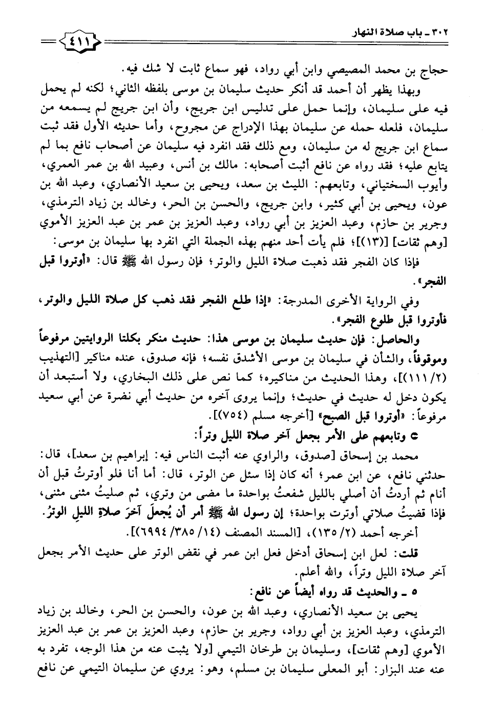 محمد بن إسحاق [صدوق، والراوي عنه أثبت الناس فيه: إبراهيم بن سعد]، قال: حدثني نافع، عن ابن عمر؛ أنه كان إذا سئل عن الوتر، قال: أما أنا فلو أوترتُ قبل أن أنام ثم أردتُ أن أصلي بالليل شفعتُ بواحدة ما مضى من وتري، ثم صليتُ مثنى مثنى، فإذا قضيتُ صلاتي أوترت بواحدة؛ إن رسول الله - صلى الله عليه وسلم - أمر أن يُجعلَ آخرَ صلاةِ الليلِ الوترُ.