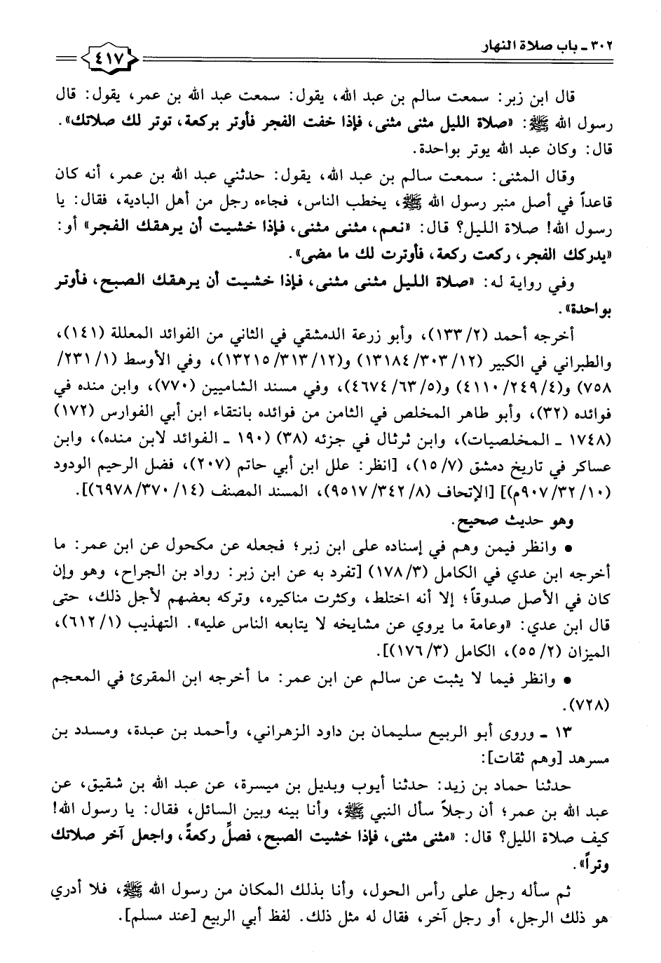 وقال المثنى: سمعت سالم بن عبد الله، يقول: حدثني عبد الله بن عمر، أنه كان قاعدًا في أصل منبر رسول الله - صلى الله عليه وسلم -، يخطب الناس، فجاءه رجل من أهل البادية، فقال: يا رسول الله! صلاة الليل؟ قال: "نعم، مثنى مثنى، فإذا خشيت أن يرهقك الفجر" أو: "يدركك الفجر، ركعت ركعة، فأوترت لك ما مضى".