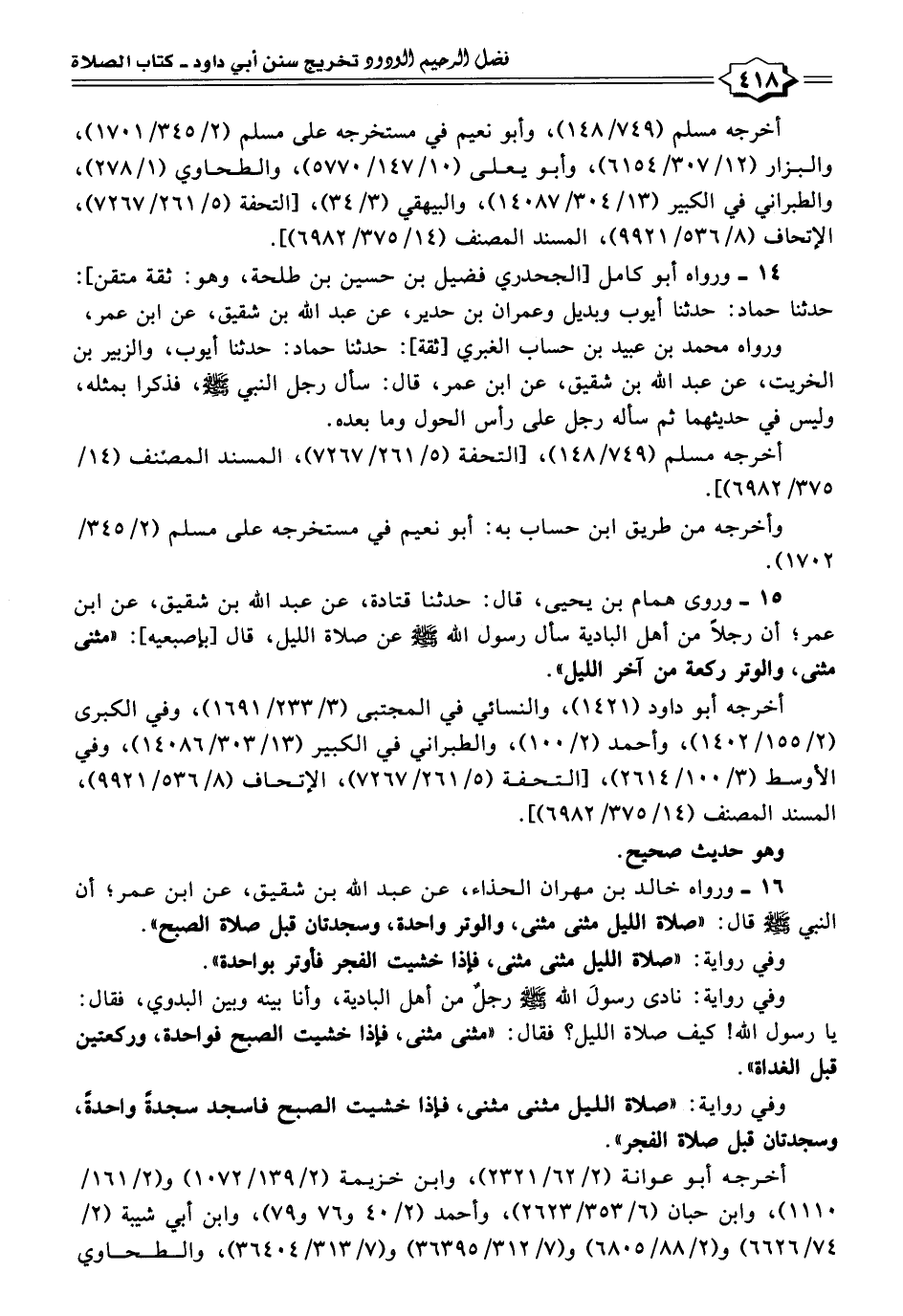 ١٦ - ورواه خالد بن مهران الحذاء، عن عبد الله بن شقيق، عن ابن عمر؛ أن النبي - صلى الله عليه وسلم - قال: "صلاة الليل مثنى مثنى، والوتر واحدة، وسجدتان قبل صلاة الصبح".