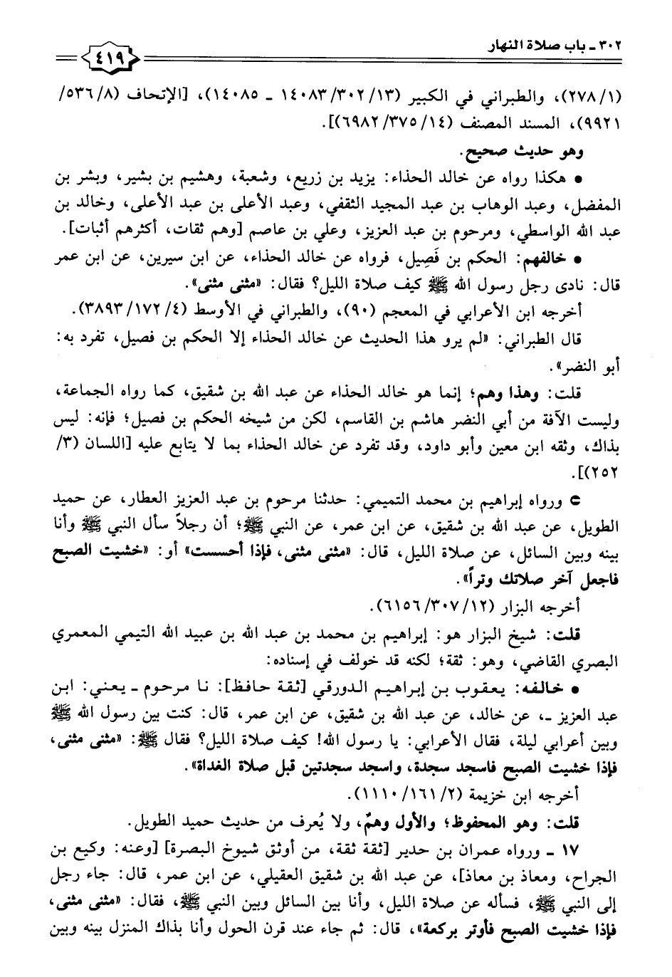 • خالفه: يعقوب بن إبراهيم الدورقي [ثقة حافظ]: نا مرحوم - يعني: ابن عبد العزيز -، عن خالد، عن عبد الله بن شقيق، عن ابن عمر، قال: كنت بين رسول الله - صلى الله عليه وسلم - وبين أعرابي ليلة، فقال الأعرابي: يا رسول الله! كيف صلاة الليل؟ فقال - صلى الله عليه وسلم -: "مثنى مثنى، فإذا خشيت الصبح فاسجد سجدة، واسجد سجدتين قبل صلاة الغداة".