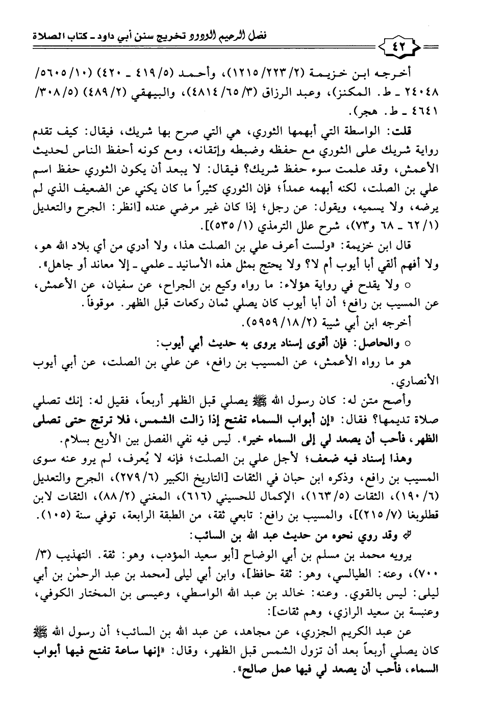 وأصح متن له: كان رسول الله - صلى الله عليه وسلم - يصلي قبل الظهر أربعًا، فقيل له: إنك تصلي صلاة تديمها؟ فقال: "إن أبواب السماء تفتح إذا زالت الشمس، فلا ترتج حتى تصلى الظهر، فأحب أن يصعد لي إلى السماء خير". ليس فيه نفي الفصل بين الأربع بسلام.