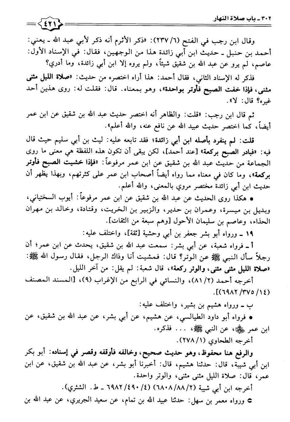 قلت: لم ينفرد بأصله ابن أبي زائدة؛ فقد تابعه عليه: ليث بن أبي سليم حيث قال فيه: "فبادر الصبح بركعة" [عند أحمد]، لكن يبقى أن تكون هذه اللفظة هي معنى ما روى الجماعة من حديث عبد الله بن شقيق عن ابن عمر مرفوعًا: "فإذا خشيت الصبح فأوتر بركعة"، وما كان في معناه مما رواه أيضًا أصحاب ابن عمر على كثرتهم، وبهذا يظهر أن حديث ابن أبي زائدة مختصر مروي بالمعنى، والله أعلم.