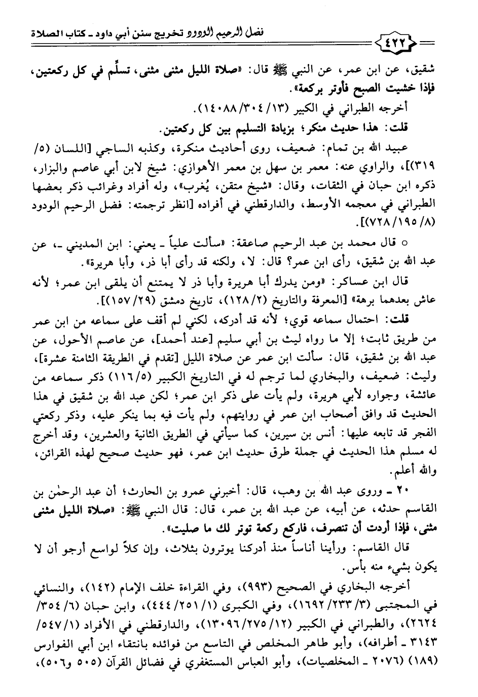 قلت: احتمال سماعه قوي؛ لأنه قد أدركه، لكني لم أقف على سماعه من ابن عمر من طريق ثابت؛ إلا ما رواه ليث بن أبي سليم [عند أحمد]، عن عاصم الأحول، عن عبد الله بن شقيق، قال: سألت ابن عمر عن صلاة الليل [تقدم في الطريقة الثامنة عشرة]، وليث: ضعيف، والبخاري لما ترجم له في التاريخ الكبير (٥/ ١١٦) ذكر سماعه من عائشة، وجواره لأبي هريرة، ولم يأت على ذكر ابن عمر؛ لكن عبد الله بن شقيق في هذا الحديث قد وافق أصحاب ابن عمر في روايتهم، ولم يأت فيه بما ينكر عليه، وذكر ركعتي الفجر قد تابعه عليها: أنس بن سيرين، كما سيأتي في الطريق الثانية والعشرين، وقد أخرج له مسلم هذا الحديث في جملة طرق حديث ابن عمر، فهو حديث صحيح لهذه القرائن، والله أعلم.