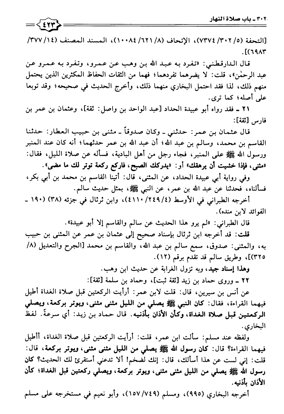 عن أنس بن سيرين، قال: قلت لابن عمر: أرأيت الركعتين قبل صلاة الغداة أطيل فيهما القراءة، فقال: كان النبي - صلى الله عليه وسلم - يصلي من الليل مثنى مثنى، ويوتر بركعة، ويصلي الركعتين قبل صلاة الغداة، وكان الأذان بأذنيه. قال حماد بن زيد: أي سرعة. لفظ البخاري.