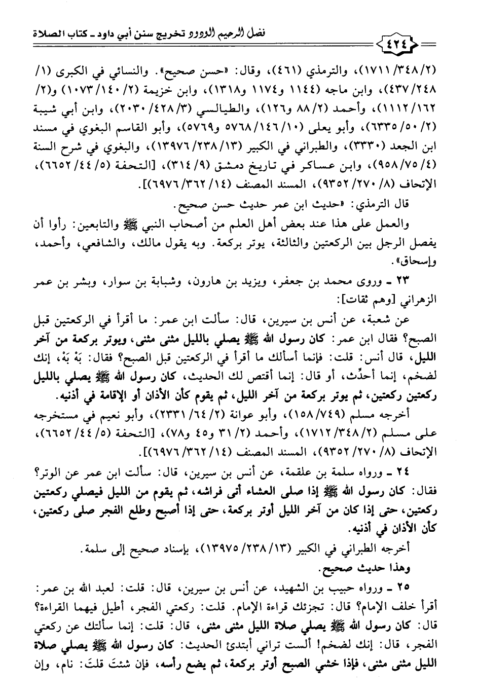 ٢٤ - ورواه سلمة بن علقمة، عن أنس بن سيرين، قال: سألت ابن عمر عن الوتر؟ فقال: كان رسول الله - صلى الله عليه وسلم - إذا صلى العشاء أتى فراشه، ثم يقوم من الليل فيصلي ركعتين ركعتين، حتى إذا كان من آخر الليل أوتر بركعة، حتى إذا أصبح وطلع الفجر صلى ركعتين، كأن الأذان في أذنيه.