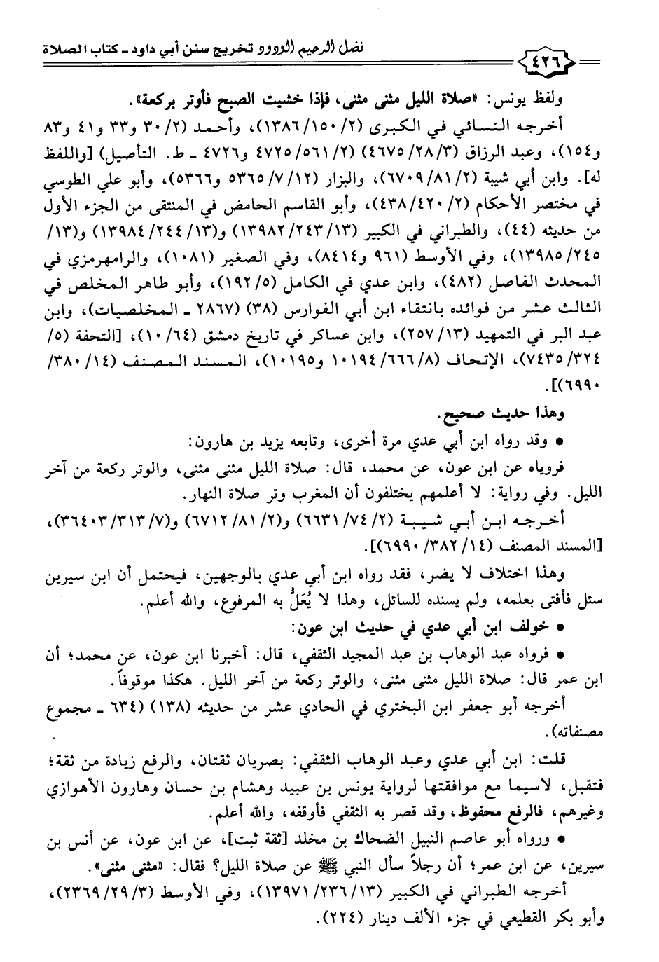 • ورواه أبو عاصم النبيل الضحاك بن مخلد [ثقة ثبت]، عن ابن عون، عن أنس بن سيرين، عن ابن عمر؛ أن رجلًا سأل النبي - صلى الله عليه وسلم - عن صلاة الليل؟ فقال: "مثنى مثنى".