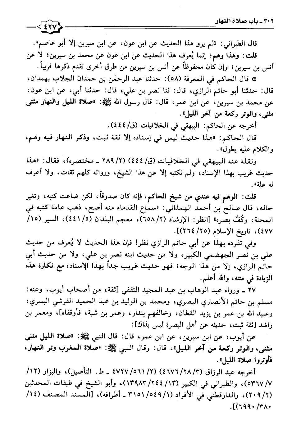 • قال الحاكم في المعرفة (٥٨): حدثنا عبد الرحمن بن حمدان الجلاب بهمدان، قال: حدثنا أبو حاتم الرازي، قال: ثنا نصر بن علي، قال: حدثنا أبي، عن ابن عون، عن محمد بن سيرين، عن ابن عمر، قال: قال رسول الله - صلى الله عليه وسلم -: "صلاة الليل والنهار مثنى مثنى، والوتر ركعة من آخر الليل".