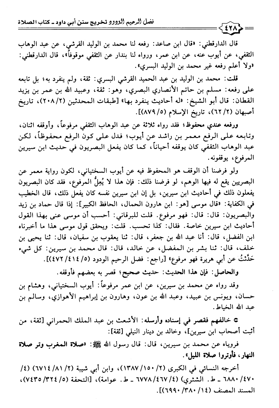 قال الدارقطني: "قال ابن صاعد: رفعه لنا محمد بن الوليد القرشي، عن عبد الوهاب الثقفي، عن أيوب عنه، عن ابن عمر، ورواه لنا بندار عن الثقفي موقوفًا"، قال الدارقطني: "ولا أعلم رفعه غير محمد بن الوليد البسري".