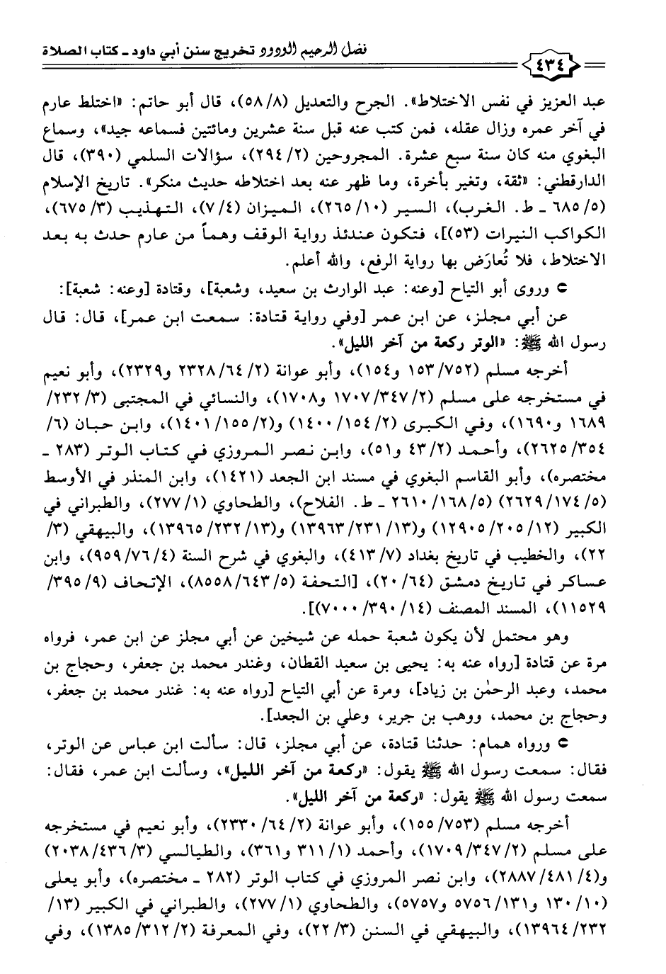 أخرجه مسلم (١٧٥٢/ ٥٣ و ١٥٤)، وأبو عوانة (٢/ ٢٣٢٨/٦٤ و ٢٣٢٩)، وأبو نعيم في مستخرجه على مسلم (٢/ ٣٤٧/ ١٧٠٧ و ١٧٠٨)، والنسائي في المجتبى (٣/ ٢٣٢/ ١٦٨٩ و ١٦٩٠)، وفي الكبرى (٢/ ١٥٤/ ١٤٠٠) و (٢/ ١٥٥/ ١٤٠١)، وابن حبان (٦/ ٣٥٤/ ٢٦٢٥)، وأحمد (٢/ ٤٣ و ٥١)، وابن نصر المروزي في كتاب الوتر (٢٨٣ - مختصره)، وأبو القاسم البغوي في مسند ابن الجعد (١٤٢١)، وابن المنذر في الأوسط (٥/ ١٧٤/ ٢٦٢٩) (٥/ ١٦٨/ ٢٦١٠ - ط. الفلاح)، والطحاوي (١/ ٢٧٧)، والطبراني في الكبير (١٢/ ٢٠٥/ ١٢٩٠٥) و (١٣/ ٢٣١/ ١٣٩٦٣) و (١٣/ ٢٣٢/ ١٣٩٦٥)، والبيهقي (٣/ ٢٢)، والخطيب في تاريخ بغداد (٧/ ٤١٣)، والبغوي في شرح السنة (٤/ ٧٦/ ٩٥٩)، وابن عساكر في تاريخ دمشق (٦٤/ ٢٠)، [التحفة (٥/ ٦٤٣/ ٨٥٥٨)، الإتحاف (٩/ ٣٩٥/ ١١٥٢٩)، المسند المصنف (١٤/ ٣٩٠/ ٧٠٠٠)].