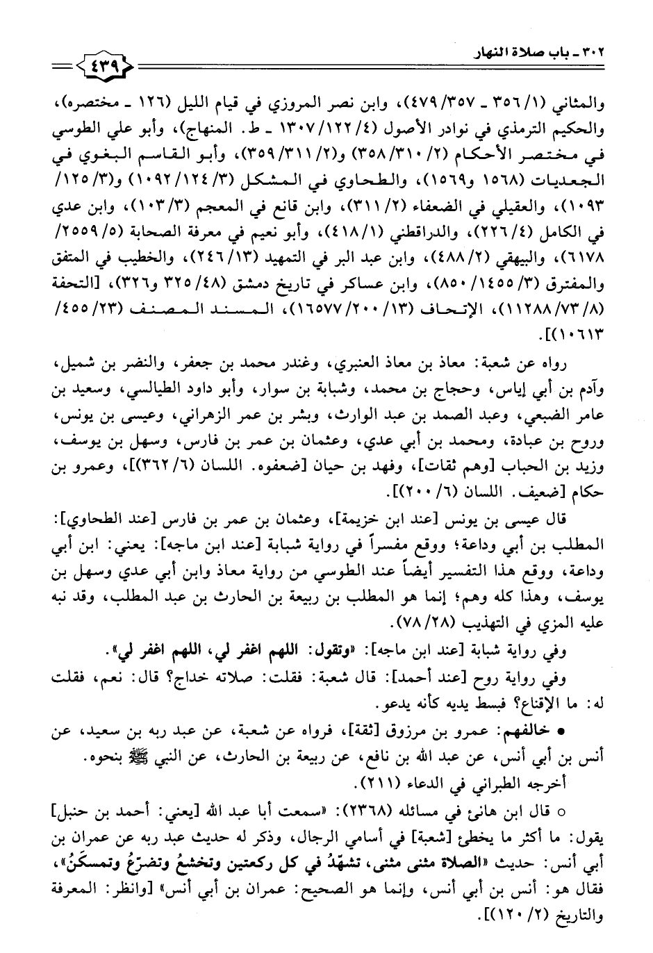والمثاني (١/ ٣٥٦ - ٣٥٧/ ٤٧٩)، وابن نصر المروزي في قيام الليل (١٢٦ - مختصره)، والحكيم الترمذي في نوادر الأصول (٤/ ١٢٢/ ١٣٠٧ - ط. المنهاج)، وأبو علي الطوسي في مختصر الأحكام (٢/ ٣٥٨/٣١٠) و (٢/ ٣١١/ ٣٥٩)، وأبو القاسم البغوي في الجعديات (١٥٦٨ و ١٥٦٩)، والطحاوي في المشكل (٣/ ١٢٤/ ١٠٩٢) و (٣/ ١٢٥/ ١٠٩٣)، والعقيلي في الضعفاء (٢/ ٣١١)، وابن قانع في المعجم (٣/ ١٠٣)، وابن عدي في الكامل (٤/ ٢٢٦)، والدراقطني (١/ ٤١٨)، وأبو نعيم في معرفة الصحابة (٥/ ٢٥٥٩/ ٦١٧٨)، والبيهقي (٢/ ٤٨٨)، وابن عبد البر في التمهيد (١٣/ ٢٤٦)، والخطيب في المتفق والمفترق (٣/ ١٤٥٥/ ٨٥٠)، وابن عساكر في تاريخ دمشق (٤٨/ ٣٢٥ و ٣٢٦)، [التحفة (٨/ ٧٣/ ١١٢٨٨)، الإتحاف (١٣/ ٢٠٠/ ١٦٥٧٧)، المسند المصنف (٢٣/ ٤٥٥/ ١٠٦١٣)].