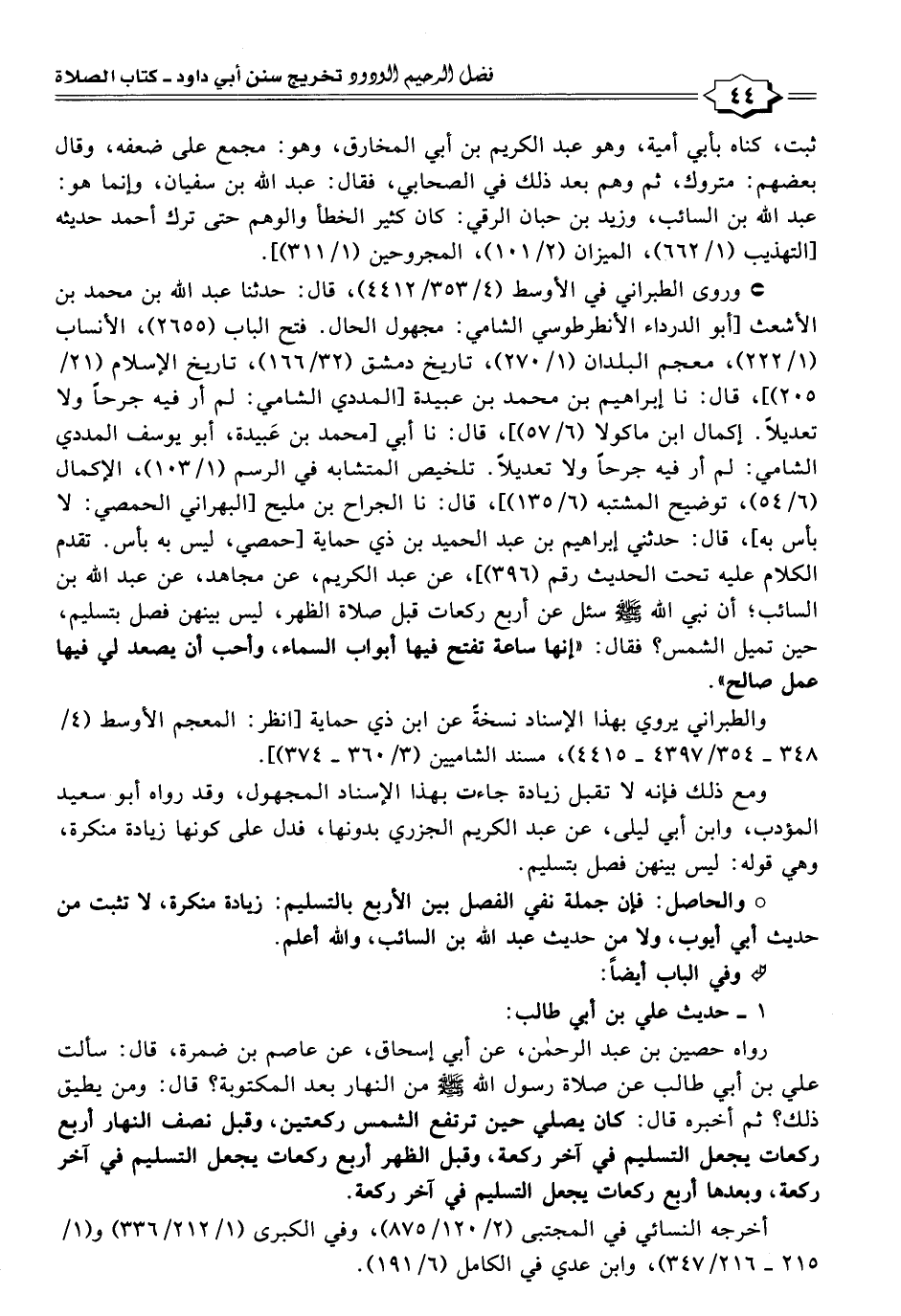 ومع ذلك فإنه لا تقبل زيادة جاءت بهذا الإسناد المجهول، وقد رواه أبو سعيد المؤدب، وابن أبي ليلى، عن عبد الكريم الجزري بدونها، فدل على كونها زيادة منكرة، وهي قوله: ليس بينهن فصل بتسليم.