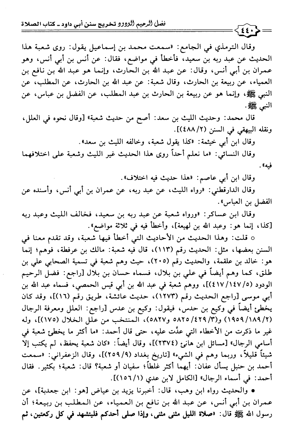 وقال الترمذي في الجامع: "سمعت محمد بن إسماعيل يقول: روى شعبة هذا الحديث عن عبد ربه بن سعيد، فأخطأ في مواضع، فقال: عن أنس بن أبي أنس، وهو عمران بن أبي أنس، وقال: عن عبد الله بن الحارث، وإنما هو عبد الله بن نافع بن العمياء، عن ربيعة بن الحارث، وقال شعبة: عن عبد الله بن الحارث، عن المطلب، عن النبي - صلى الله عليه وسلم -، وإنما هو عن ربيعة بن الحارث بن عبد المطلب، عن الفضل بن عباس، عن النبي - صلى الله عليه وسلم -.
