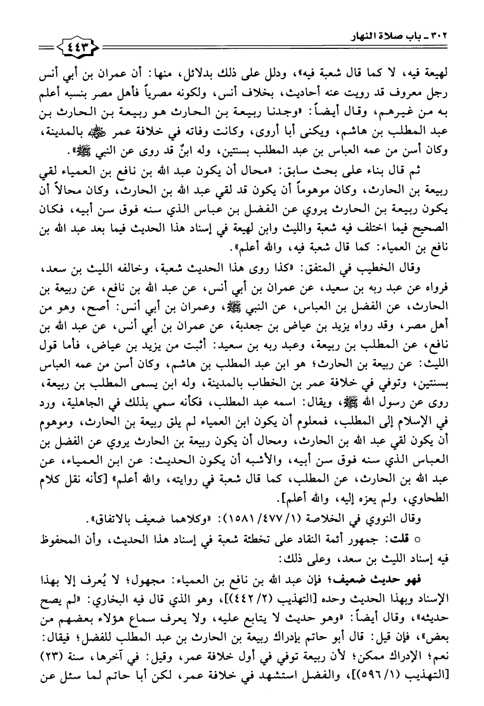 وقال الخطيب في المتفق: "كذا روى هذا الحديث شعبة، وخالفه الليث بن سعد، فرواه عن عبد ربه بن سعيد، عن عمران بن أبي أنس، عن عبد الله بن نافع، عن ربيعة بن الحارث، عن الفضل بن العباس، عن النبي - صلى الله عليه وسلم -، وعمران بن أبي أنس: أصح، وهو من أهل مصر، وقد رواه يزيد بن عياض بن جعدبة، عن عمران بن أبي أنس، عن عبد الله بن نافع، عن المطلب بن ربيعة، وعبد ربه بن سعيد: أثبت من يزيد بن عياض، فأما قول الليث: عن ربيعة بن الحارث؛ هو ابن عبد المطلب بن هاشم، وكان أسن من عمه العباس بسنتين، وتوفي في خلافة عمر بن الخطاب بالمدينة، وله ابن يسمى المطلب بن ربيعة، روى عن رسول الله - صلى الله عليه وسلم -، ويقال: اسمه عبد المطلب، فكأنه سمي بذلك في الجاهلية، ورد في الإسلام إلى المطلب، فمعلوم أن يكون ابن العمياء لم يلق ربيعة بن الحارث، وموهوم أن يكون لقي عبد الله بن الحارث، ومحال أن يكون ربيعة بن الحارث يروي عن الفضل بن العباس الذي سنه فوق سن أبيه، والأشبه أن يكون الحديث: عن ابن العمياء، عن عبد الله بن الحارث، عن المطلب، كما قال شعبة في روايته، والله أعلم" [كأنه نقل كلام الطحاوي، ولم يعزه إليه، والله أعلم].