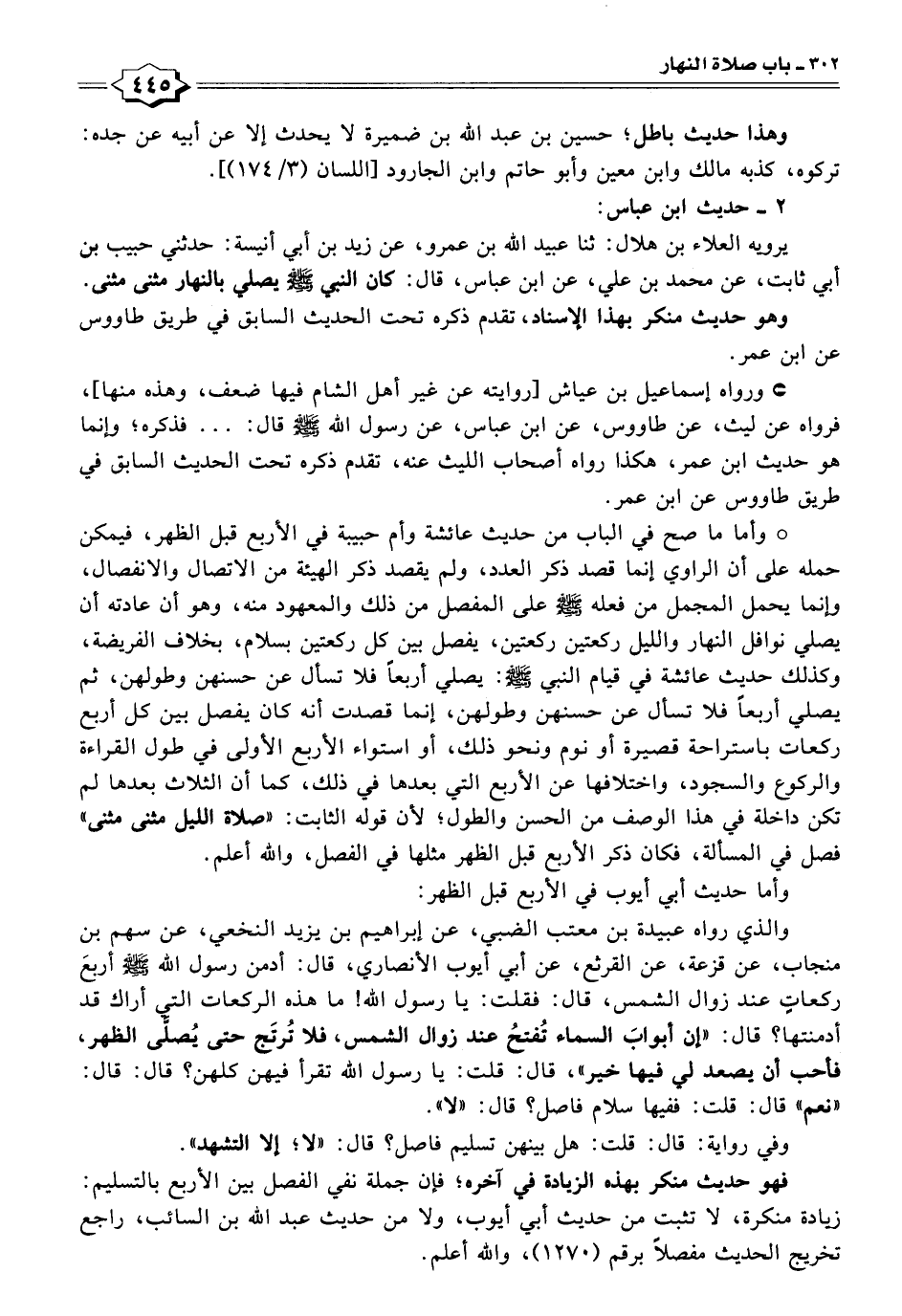 والذي رواه عبيدة بن معتب الضبي، عن إبراهيم بن يزيد النخعي، عن سهم بن منجاب، عن قزعة، عن القرثع، عن أبي أيوب الأنصاري، قال: أدمن رسول الله - صلى الله عليه وسلم - أربعَ ركعاتٍ عند زوال الشمس، قال: فقلت: يا رسول الله! ما هذه الركعات التى أراك قد أدمنتها؟ قال: "إن أبوابَ السماء تُفتحُ عند زوال الشمس، فلا تُرتَج حتى يُصلّى الظهر، فأحب أن يصعد لي فيها خير"، قال: قلت: يا رسول الله تقرأ فيهن كلهن؟ قال: قال: "نعم" قال: قلت: ففيها سلام فاصل؟ قال: "لا".