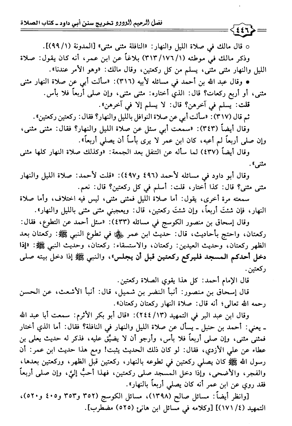 وقال أبو داود في مسائله لأحمد (٤٩٦ و ٤٩٧): "قلت لأحمد: صلاة الليل والنهار مثنى مثنى؟ قال: كذا أختار، قلت: أسلم في كل ركعتين؟ قال: نعم.